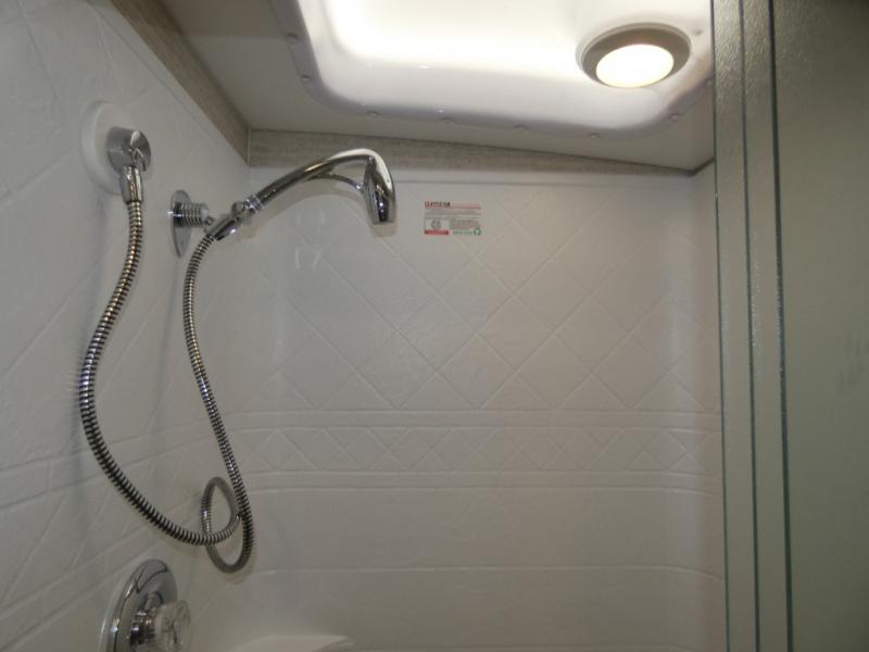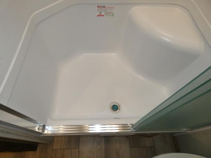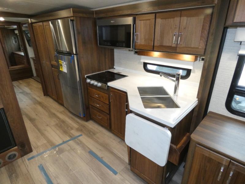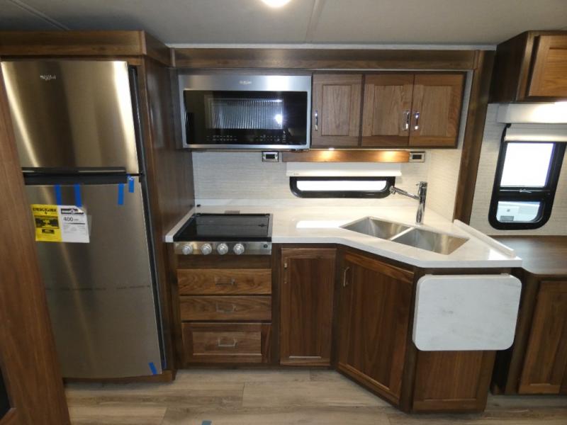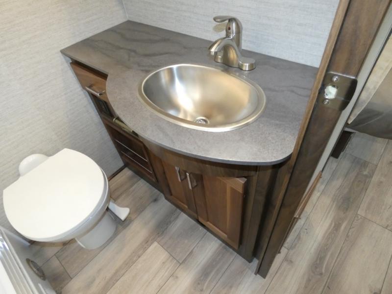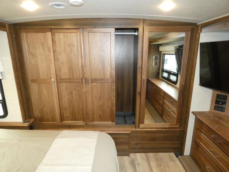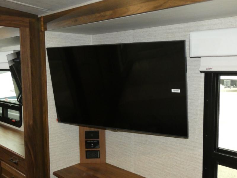 You can have many adventures of all sorts with this Forza Class A diesel motorhome! There is so much interior living space because of the three large slides, and there is also great relaxation found with the swivel/reclining cab seats, the BenchMark dinette, and the TrueComfort+ sofa. The private bedroom has quite a bit of storage space with its chest of drawers and full-width wardrobe, and there is also a 40" HDTV and queen-size bed with nightstands on either side. The kitchen is going to be amazingly helpful with its residential refrigerator, convection microwave, flip-up countertop extension, and pantry, and you will also love having a full bathroom with a 38" x 30" shower with seat, a textured glass shower door, and a bath skylight.