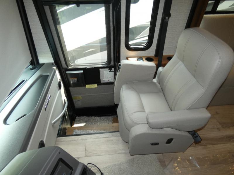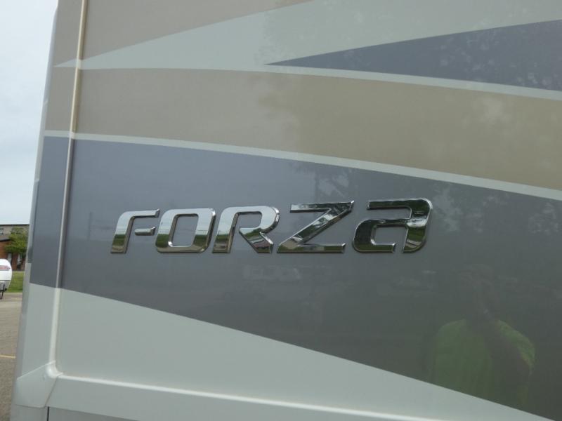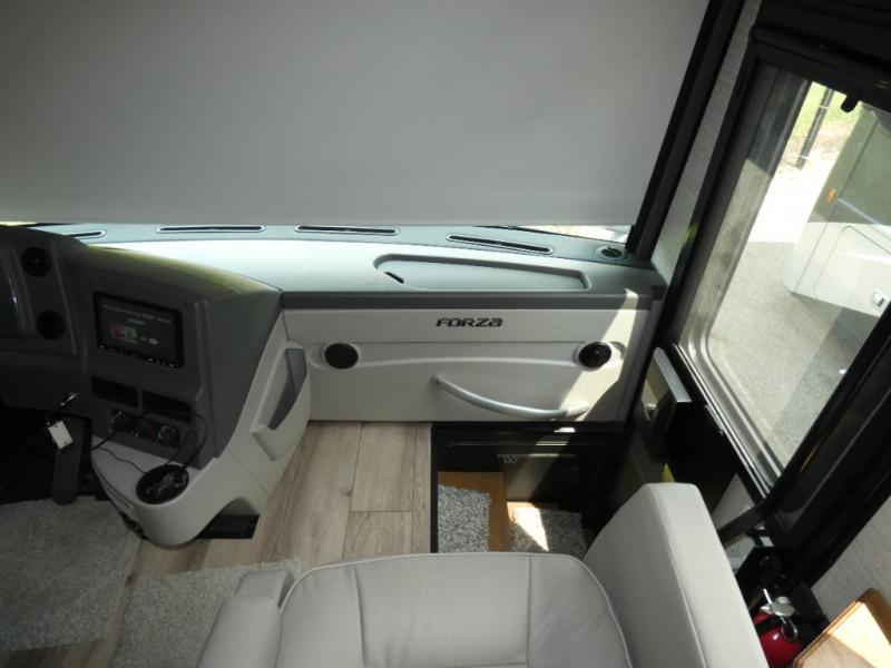 There isn't a thing you won't love about the Winnebago Forza Class A diesel motorhome! These powerful and practical coaches have excellent quality in their construction, and the undercarriage lighting is quite stylish and impressive. You'll find NeWay air suspension with V-Ride, automatic hydraulic leveling jacks, a 10,000-LB hitch, and automatic entrance steps. Sitting in the cab will be enjoyable with the multi-adjustable swivel and recline seats, the radio/rearview monitor system with 9" LCD color touchscreen, the cellphone interface to radio, and the TRW® tilt/telescopic steering column with foot-actuated pedal. The interior has a Firefly switch panel that lights up when it's dark, and the 6,000W gas generator is what you need to power your coach. You will also find vinyl flooring throughout, blackout roller shades, Corian countertops, a textured glass shower door, and many more comforts you'd expect to find at home!