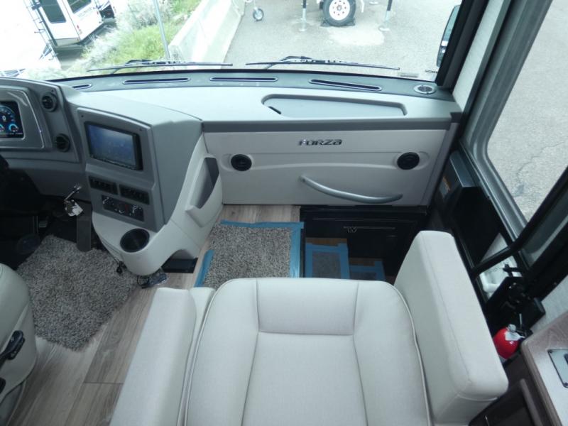 There isn't a thing you won't love about the Winnebago Forza Class A diesel motorhome! These powerful and practical coaches have excellent quality in their construction, and the undercarriage lighting is quite stylish and impressive. You'll find NeWay air suspension with V-Ride, automatic hydraulic leveling jacks, a 10,000-LB hitch, and automatic entrance steps. Sitting in the cab will be enjoyable with the multi-adjustable swivel and recline seats, the radio/rearview monitor system with 9" LCD color touchscreen, the cellphone interface to radio, and the TRW® tilt/telescopic steering column with foot-actuated pedal. The interior has a Firefly switch panel that lights up when it's dark, and the 6,000W Cummins Onan generator is what you need to power your coach. You will also find vinyl flooring throughout, blackout roller shades, Corian countertops, a textured glass shower door, and many more comforts you'd expect to find at home!