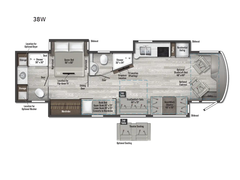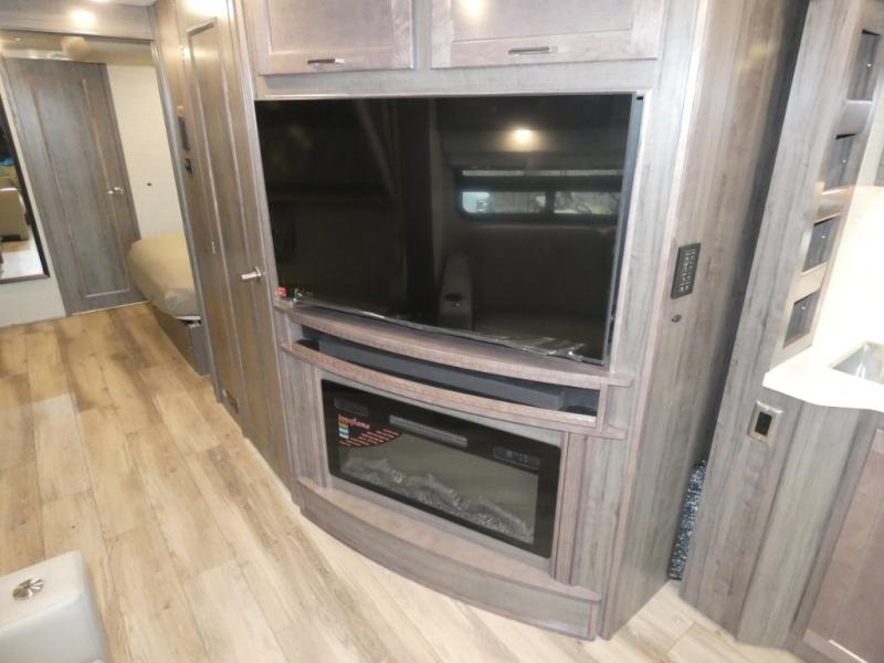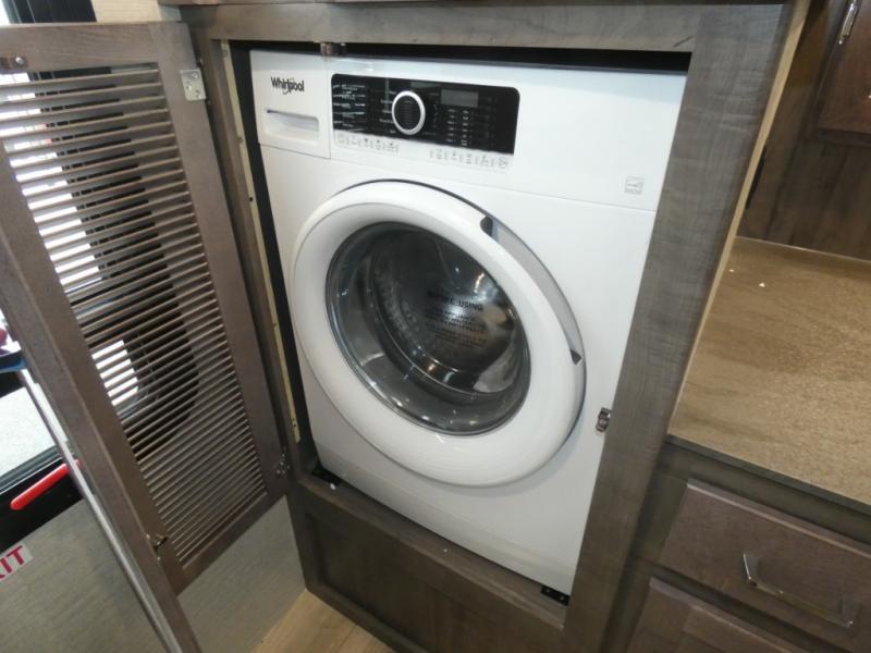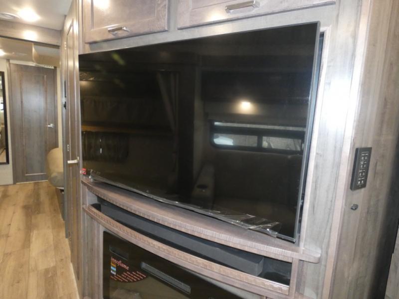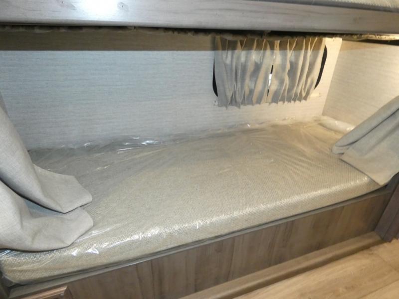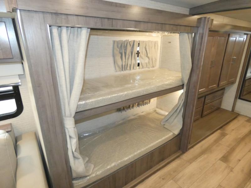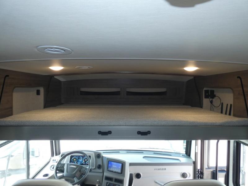 You can bet that the bunk beds on this Forza Class A diesel motorhome are going to be a big draw for your kids! Use the Studio Loft drop-down bed and you've instantly got more sleeping space. The master suite that has its own full bathroom is certainly going to entice you! Not only is there a full bathroom back in the master suite, but there is also a second full bathroom out in the main living area so that everyone else can have a place to get ready each morning too. The reclining/swivel cab seats are helpful because they add more lounge space to the main living area, and the TrueComfort+ sofa with a lap table is right across from the fireplace and 50" HDTV for easy viewing. You will also have a fully equipped kitchen with plenty of tools to make your famous dinners for everyone.