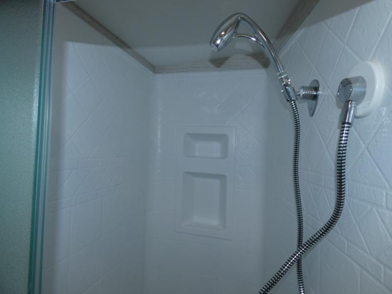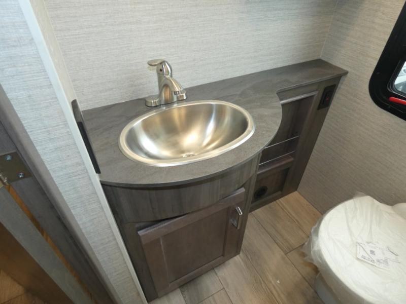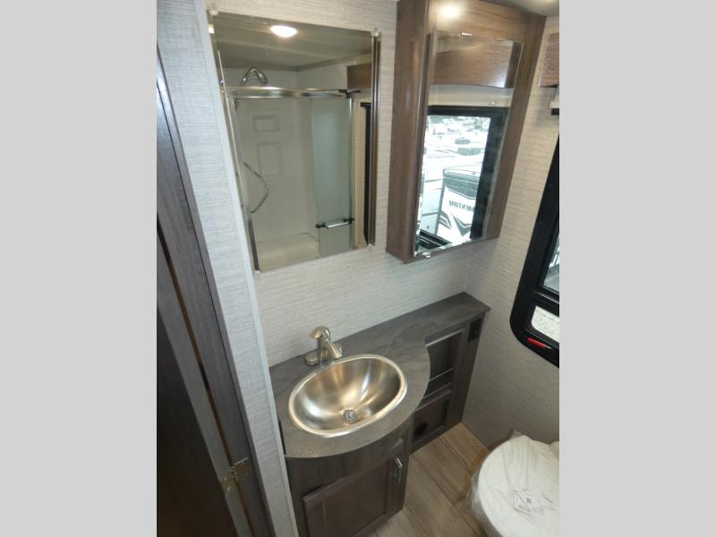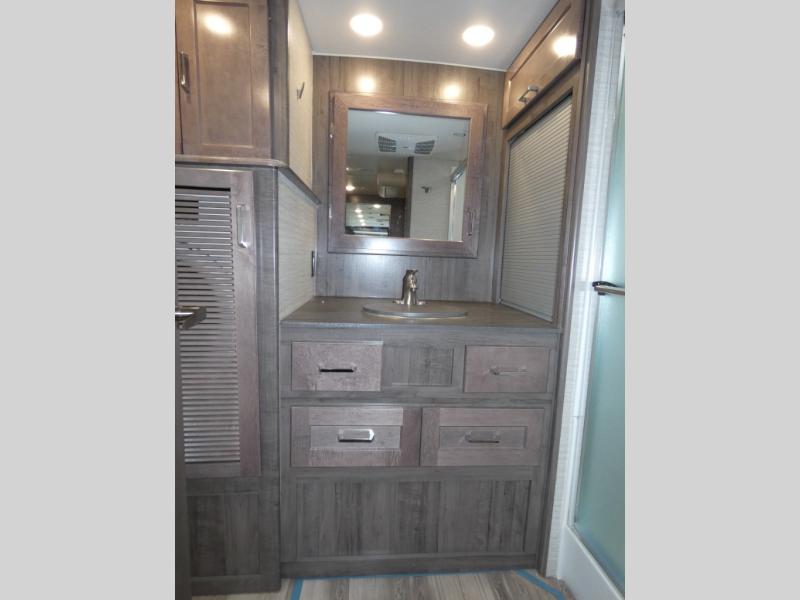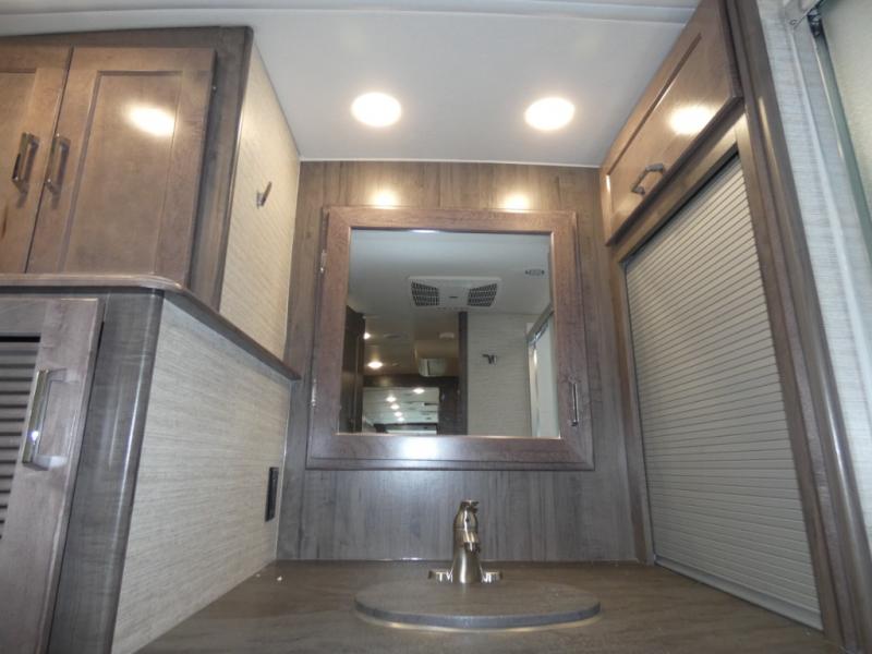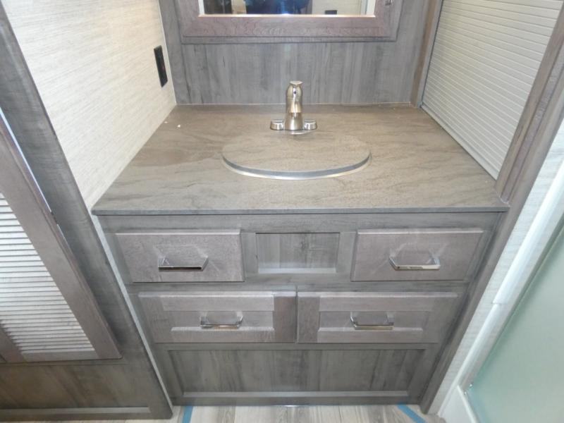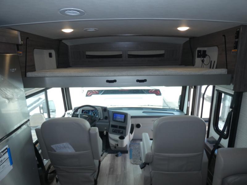 You can bet that the bunk beds on this Forza Class A diesel motorhome are going to be a big draw for your kids! Use the Studio Loft drop-down bed and you've instantly got more sleeping space. The master suite that has its own full bathroom is certainly going to entice you! Not only is there a full bathroom back in the master suite, but there is also a second full bathroom out in the main living area so that everyone else can have a place to get ready each morning too. The reclining/swivel cab seats are helpful because they add more lounge space to the main living area, and the TrueComfort+ sofa with a lap table is right across from the fireplace and 50" HDTV for easy viewing. You will also have a fully equipped kitchen with plenty of tools to make your famous dinners for everyone.