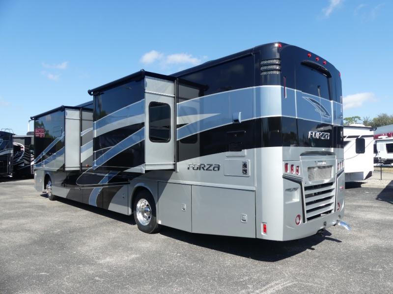 There isn't a thing you won't love about the Winnebago Forza Class A diesel motorhome! These powerful and practical coaches have excellent quality in their construction, and the undercarriage lighting is quite stylish and impressive. You'll find NeWay air suspension with V-Ride, automatic hydraulic leveling jacks, a 10,000-LB hitch, and automatic entrance steps. Sitting in the cab will be enjoyable with the multi-adjustable swivel and recline seats, the radio/rearview monitor system with 9" LCD color touchscreen, the cellphone interface to radio, and the TRW® tilt/telescopic steering column with foot-actuated pedal. The interior has a Firefly switch panel that lights up when it's dark, and the 6,000W Cummins Onan generator is what you need to power your coach.