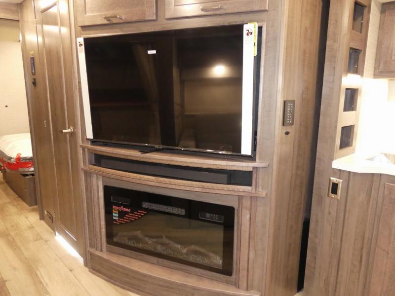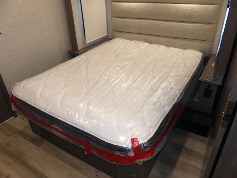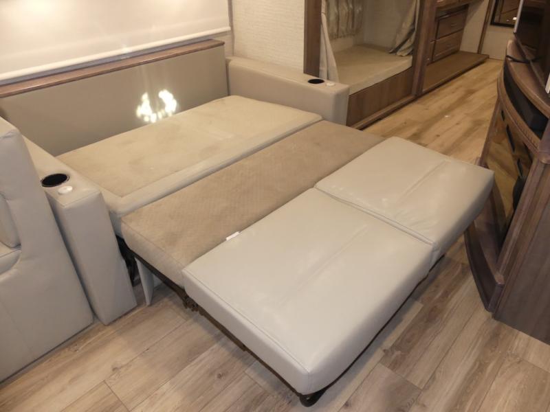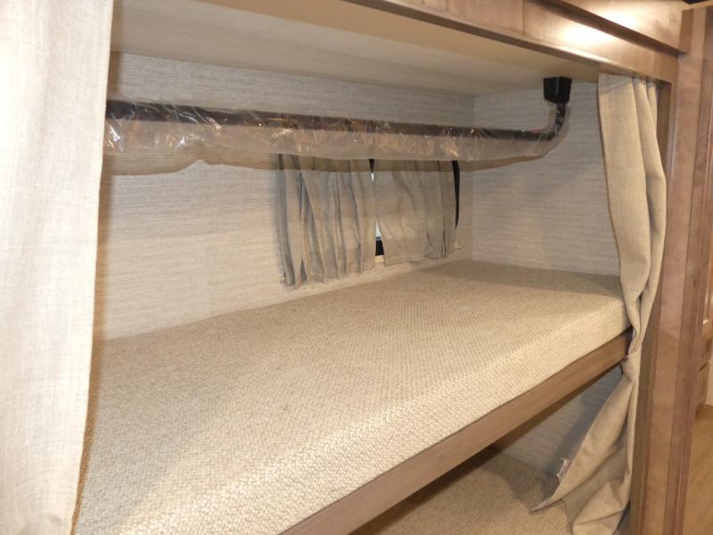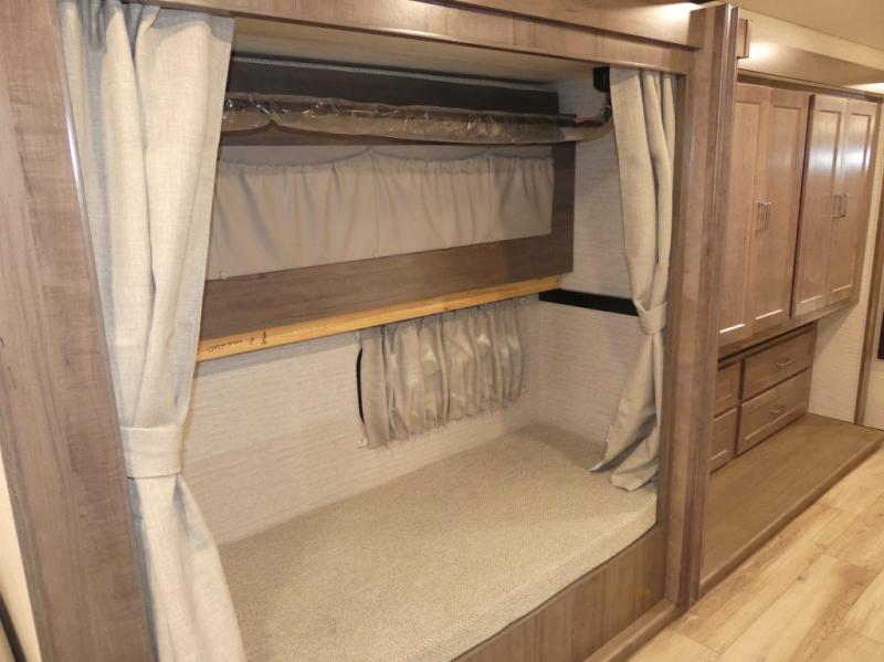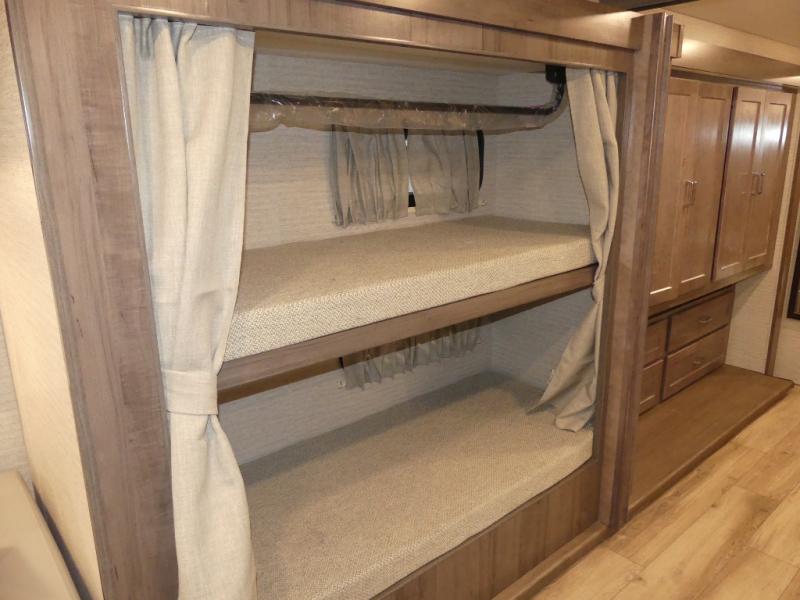 You can bet that the bunk beds on this Forza Class A diesel motorhome are going to be a big draw for your kids! And the master suite that has its own full bathroom is certainly going to entice you! Not only is there a full bathroom back in the master suite, but there is also a second full bathroom out in the main living area so that everyone else can have a place to get ready each morning too. The reclining/swivel cab seats are helpful because they add more lounge space to the main living area, and the TrueComfort+ sofa with lap table is right across from the fireplace and 50" HDTV for easy viewing. You will also have a fully equipped kitchen with plenty of tools to make your famous dinners for everyone.