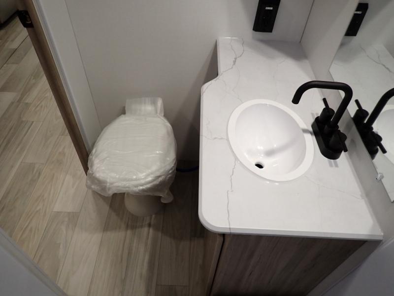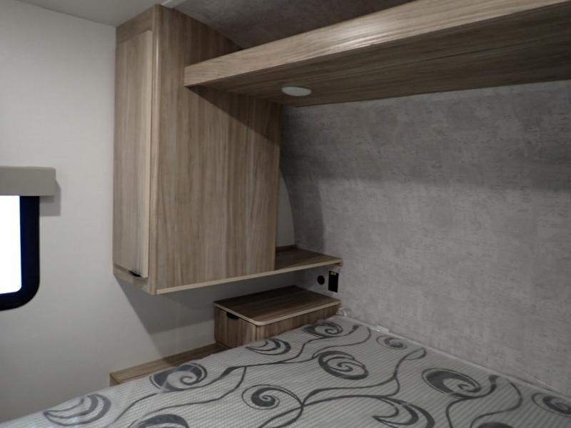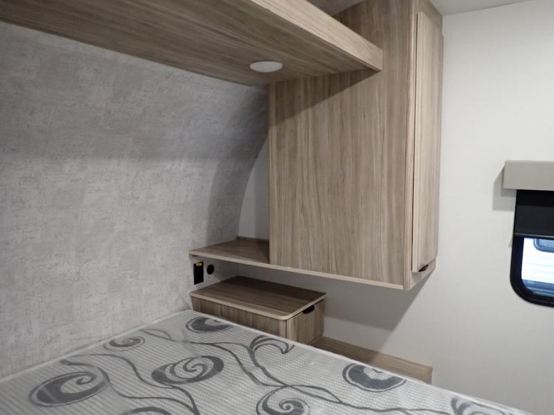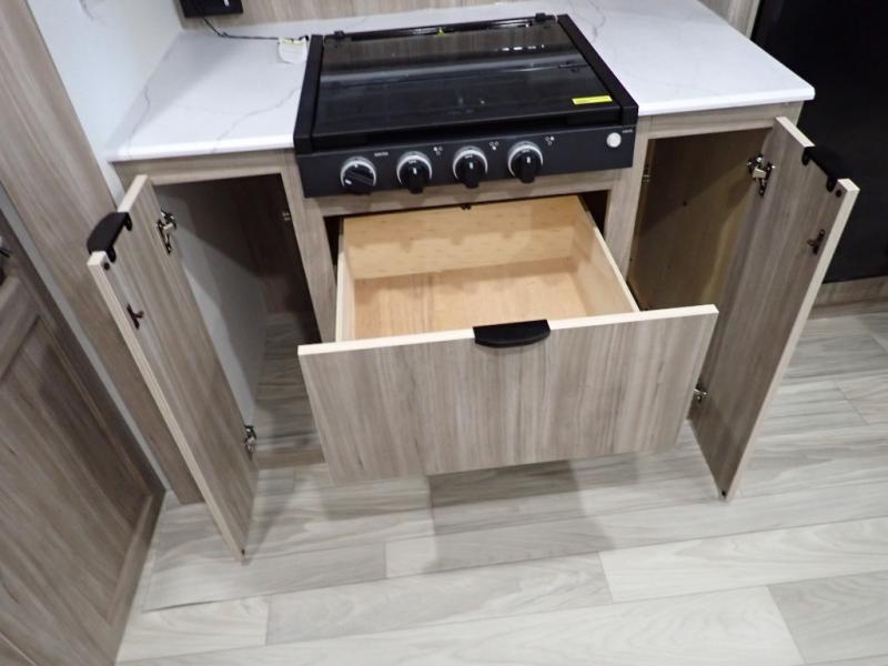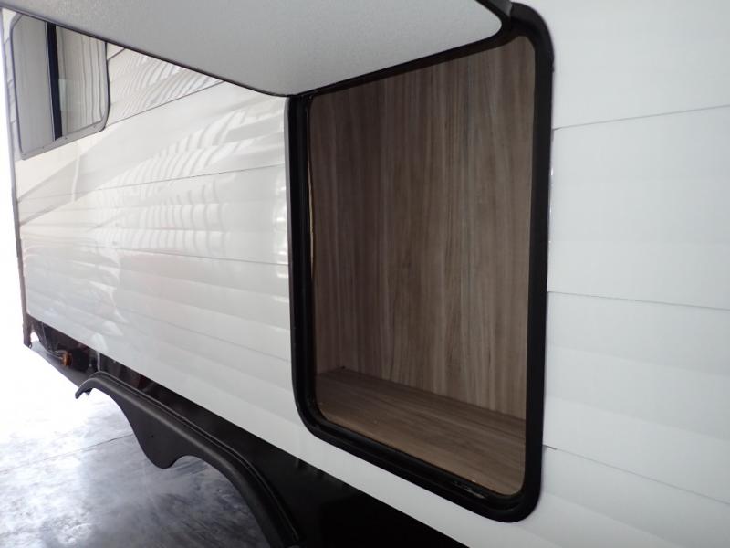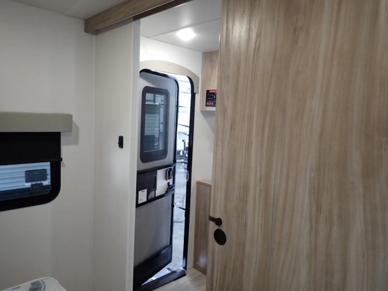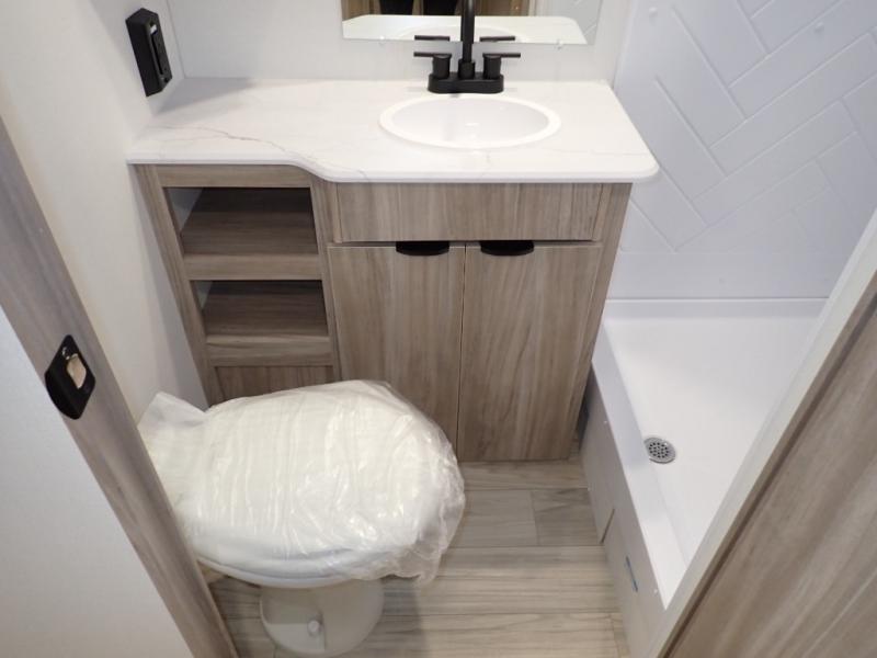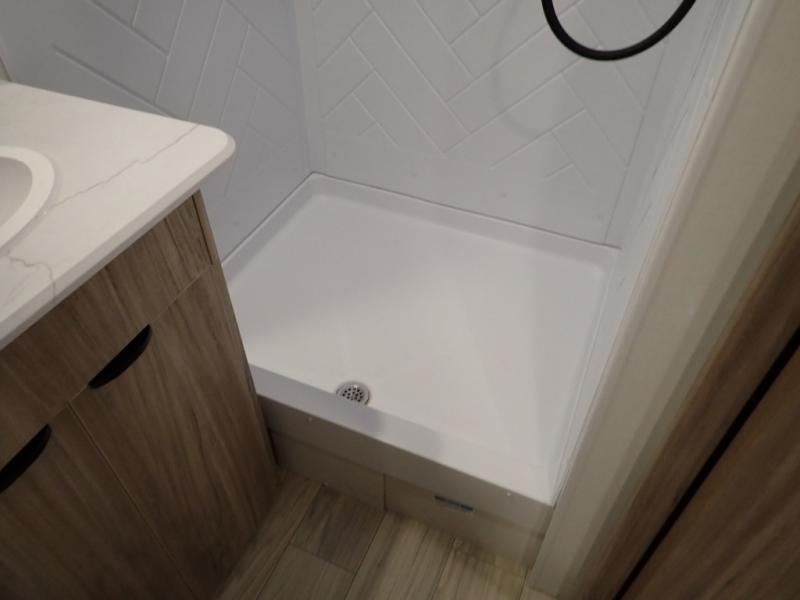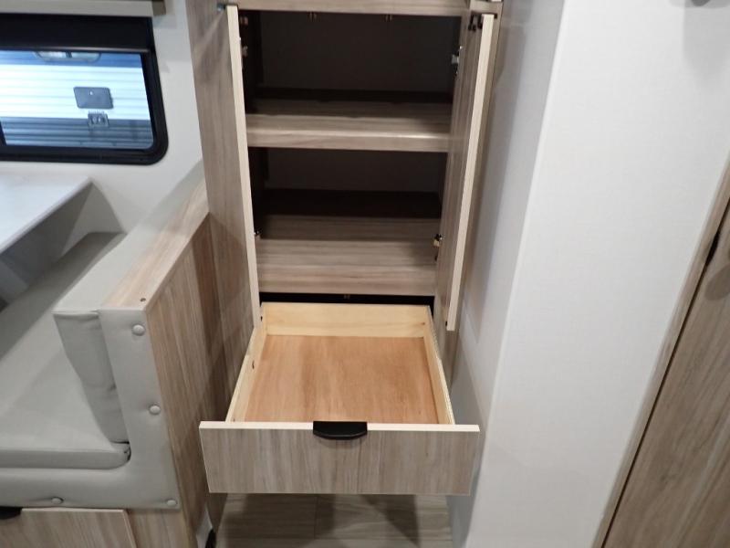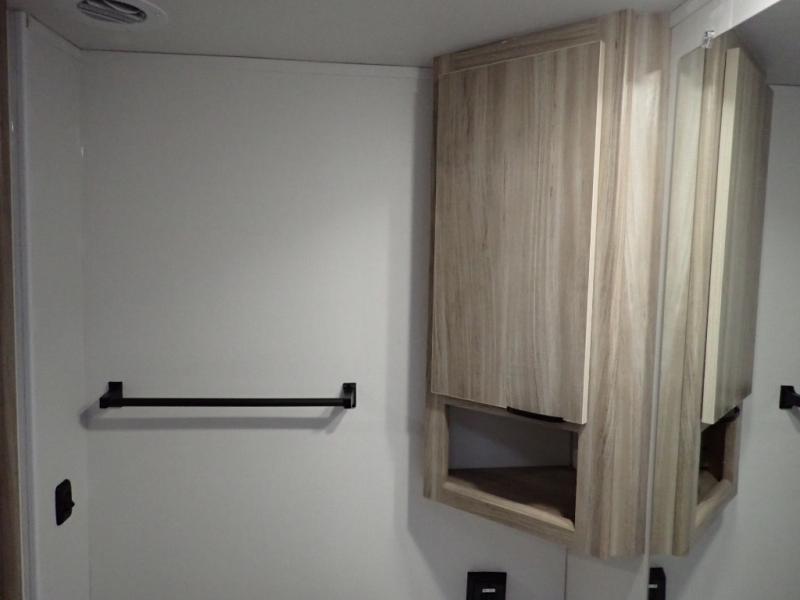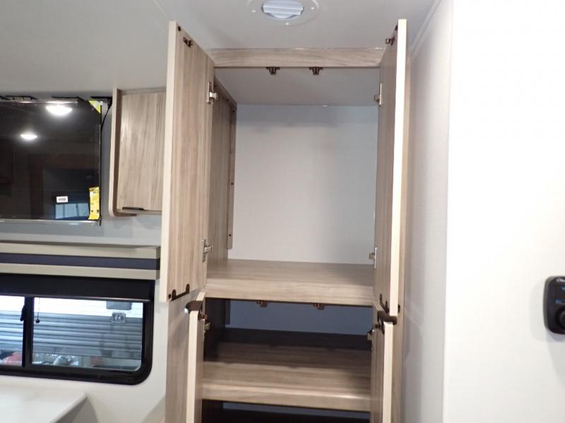 Enjoy your Access in the great outdoors! This unit features a large slide for added walking around space inside. There is sleeping for two to six depending on size and furniture choices starting with the front private bedroom featuring a space saving sliding door. You can also sleep two on the optional tri-fold sofa within the slide, and the dinette opposite can be converted for one or two little ones. You will find ample storage throughout in overhead storage cabinets, under bed storage and wardrobes, plus more. The kitchen appliances are also within the large slide, plus you will find a nice size sink in the rear roadside corner with storage both above and below. A convenient rear corner bathroom allows you to skip the use of the camp facilities and enjoy cleaning up in the privacy of your own unit. Here you will find a 30" x 36" shower, porcelain toilet and a vanity with sink and corner medicine cabinet. You will also appreciate the exterior storage door within the slide and there is also convenient pass-through storage for your larger camp items to be neatly tucked away when not in use.