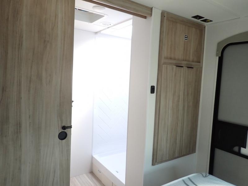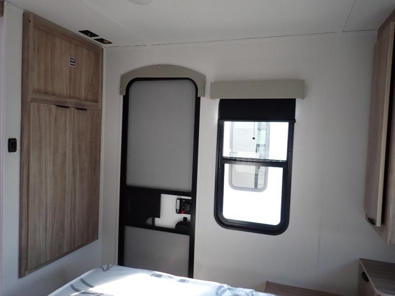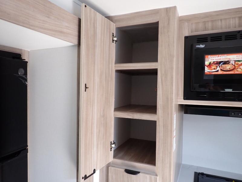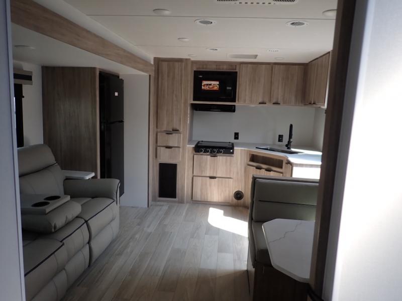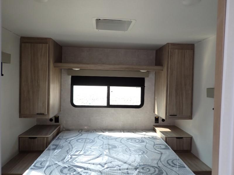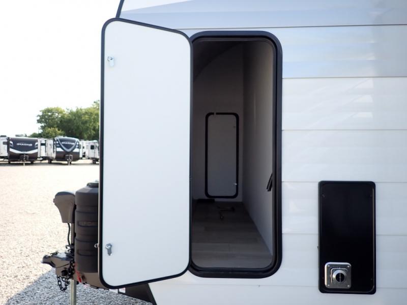 This single slide Access travel trailer features a front kitchen layout, a large roadside slide, and a private bedroom beyond a walk-through full bath. It also features both front and rear pass-through storage, as well as dual entry doors! You will find the main combined living area and kitchen open and spacious thanks to the slide. Cook your family their favorite meals with the appliances inside, dine at the 72" x 41" dinette where you can add an optional TV above to enjoy from the theater seating opposite. A convenient walk-through bath is spacious enough for two to get ready at once since it is the full width of the trailer. Next, head through space saving sliding doors to the rear private bedroom with its own access to the outside through the second entry. Here a queen bed awaits for a great nights rest. This bedroom offers plenty of storage in bedside wardrobes, a closet just off the foot of the bed, in under bed storage for extra blankets and larger items, plus so much more!