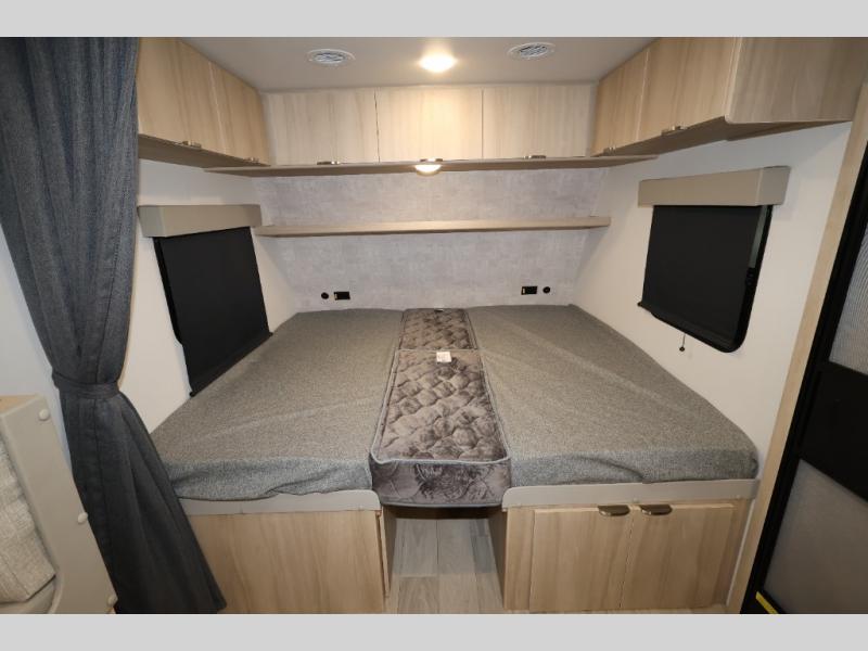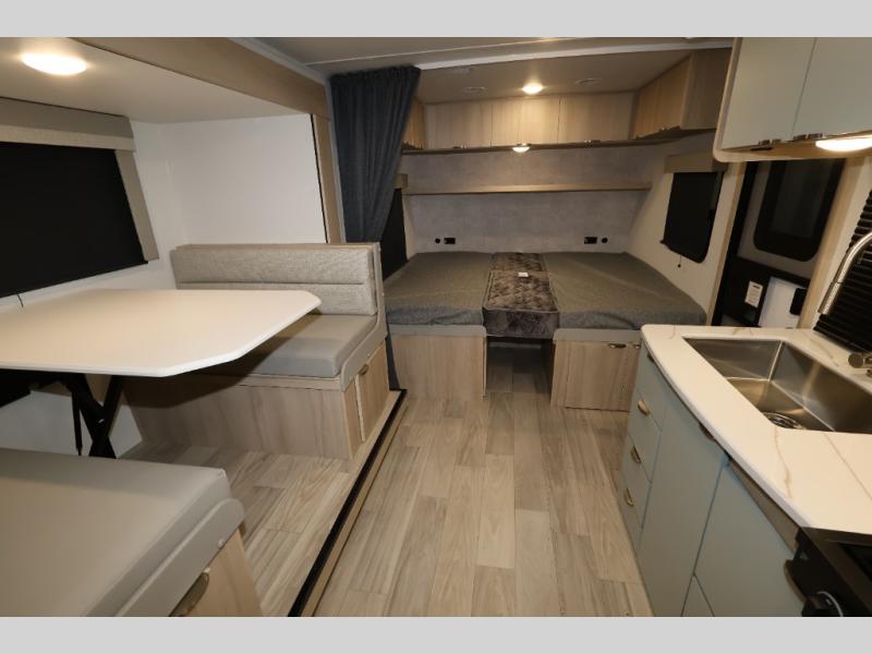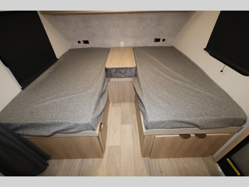 Come see just how accommodating this travel trailer can be! The two 32" x 74" twin beds up front have a nightstand in between them and a divider curtain to draw, plus they can convert into one 74" x 82" king-size bed. The 44" x 72" booth dinette slide can also convert into an extra sleeping space when you're not using it for meal time or playing games. Everyone can get squeaky clean in the full rear bathroom, and the wardrobe is a convenient place to store your linens and extra clothes. Grab a snack from the kitchen pantry or pop a bag of popcorn in the convection microwave then watch a movie on the Smart TV or head outdoors and relax underneath the power awning!