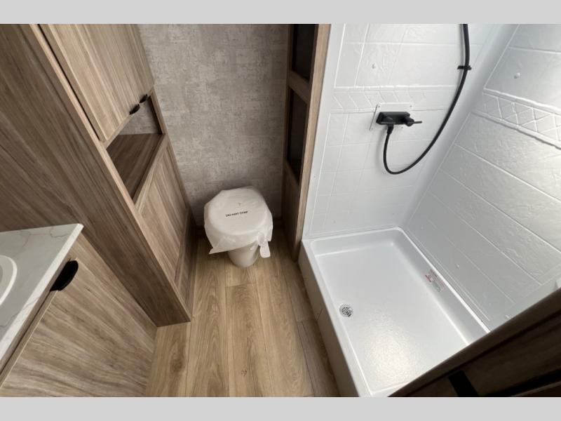 Each M-Series travel trailer features a fully enclosed underbelly, a one piece TPO fully walkable roof, NXG engineered frame with triple solid entry step for ease in entering as well as manual stabilizer jacks that make your time in camp enjoyable. These units feature ample storage both inside and out, plus versatile sleeping arrangements and complete kitchen and baths plus full overlay European style cabinetry, sealed countertops, blackout roller shades for privacy, and a large 14" x 22" skylight over each shower. This perfect blend of practicality and style offers you a functional and comfortable, budget friendly way to camp in an easy to tow trailer. Come choose yours today!
