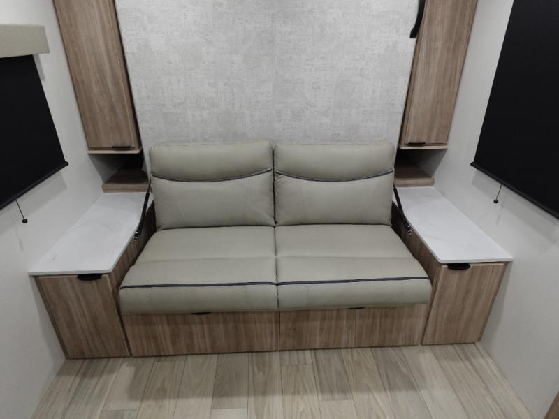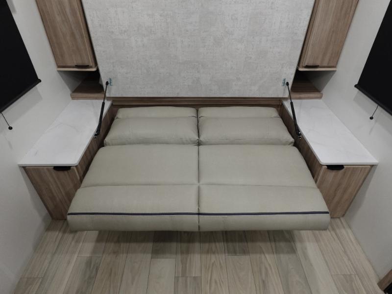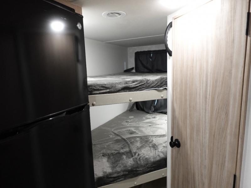 This M-Series model features sleeping for five with oversized 41" x 74" bunk beds, a 54" x 64" Murphy bed, and a dinette that can be converted to an additional bed. The Murphy bed stows away behind the sofa for daytime use of the living area. You will enjoy complete kitchen and bath amenities including a pantry for dry goods, and either a standard 10 cu. ft. RV refrigerator or an optional 8 cu. ft. gas/electric refrigerator. An additional 1.8 cu. ft. refrigerator is located outside for easy access to drinks and snacks. The full bath includes a 30" x 36" shower and large vanity with corner upper cabinet.