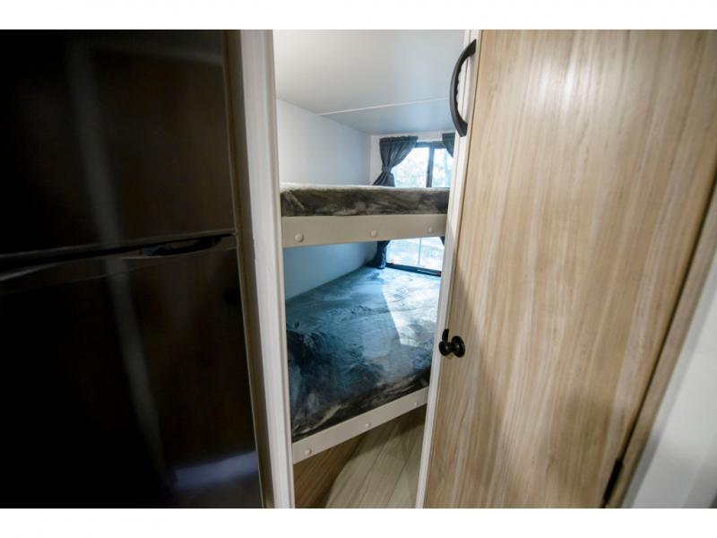 This M-Series model features sleeping for five with oversized 41" x 74" bunk beds, a 54" x 64" Murphy bed, and a dinette that can be converted to an additional bed. The Murphy bed stows away behind the sofa for daytime use of the living area. You will enjoy complete kitchen and bath amenities including a pantry for dry goods, and either a standard 10 cu. ft. RV refrigerator or an optional 8 cu. ft. gas/electric refrigerator. An additional 1.8 cu. ft. refrigerator is located outside for easy access to drinks and snacks. The full bath includes a 30" x 36" shower and large vanity with corner upper cabinet.