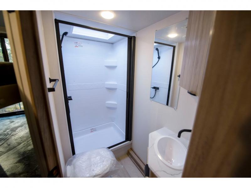 Each M-Series travel trailer features a fully enclosed underbelly, a one piece TPO fully walkable roof, NXG engineered frame with triple solid entry step for ease in entering as well as manual stabilizer jacks that make your time in camp enjoyable. These units feature ample storage both inside and out, plus versatile sleeping arrangements and complete kitchen and baths plus full overlay European style cabinetry, sealed countertops, blackout roller shades for privacy, and a large 14" x 22" skylight over each shower. This perfect blend of practicality and style offers you a functional and comfortable, budget friendly way to camp in an easy to tow trailer. Come choose yours today!