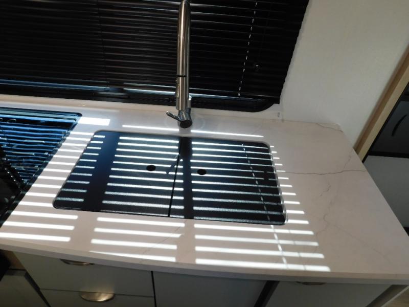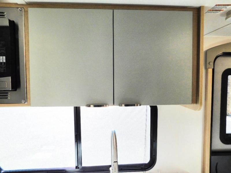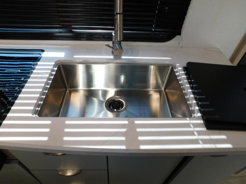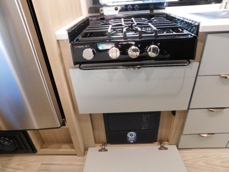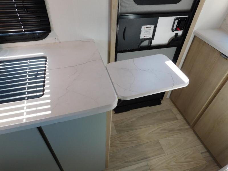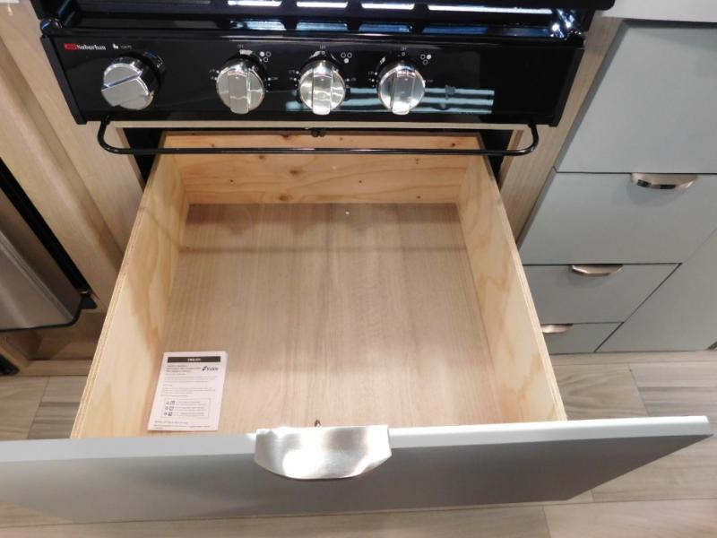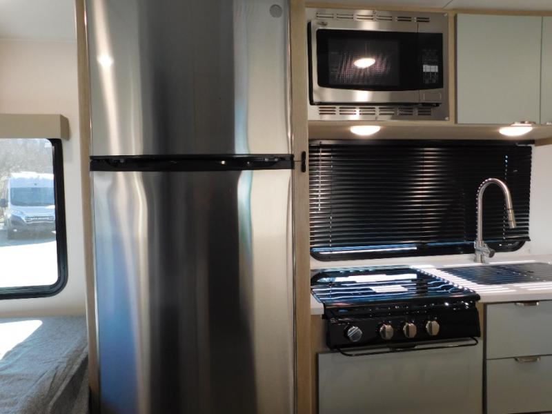 Two-burner cooktop, convection microwave, and 10.3 cu. ft. 12V refrigerator offer full kitchen functionality in a compact footprint.