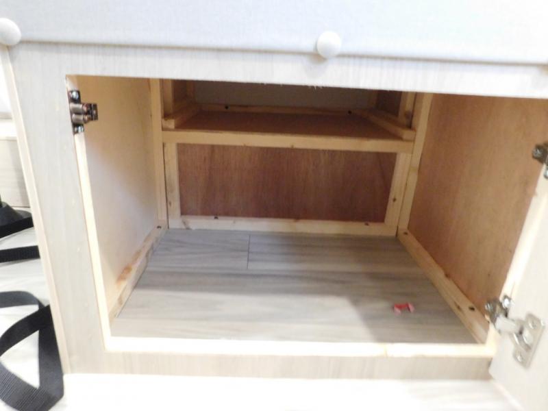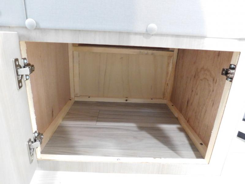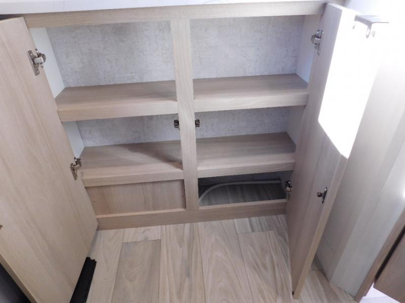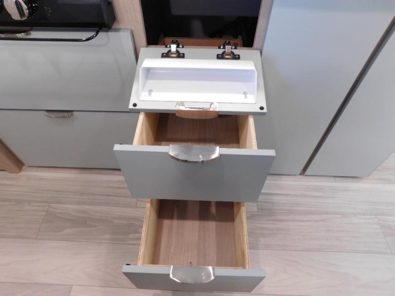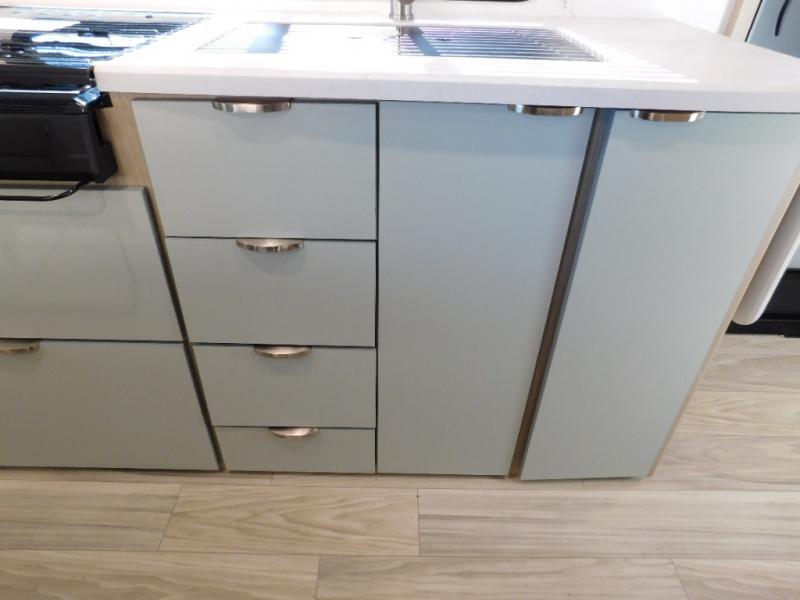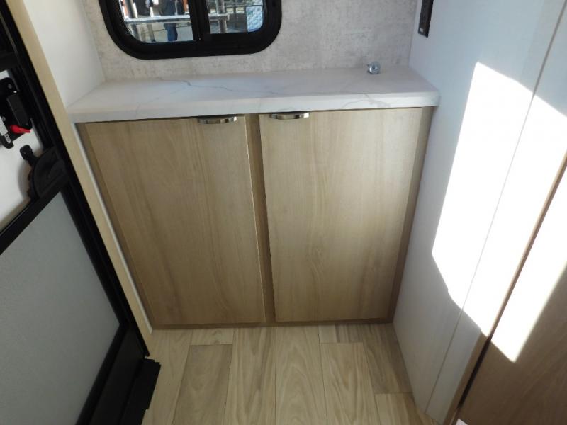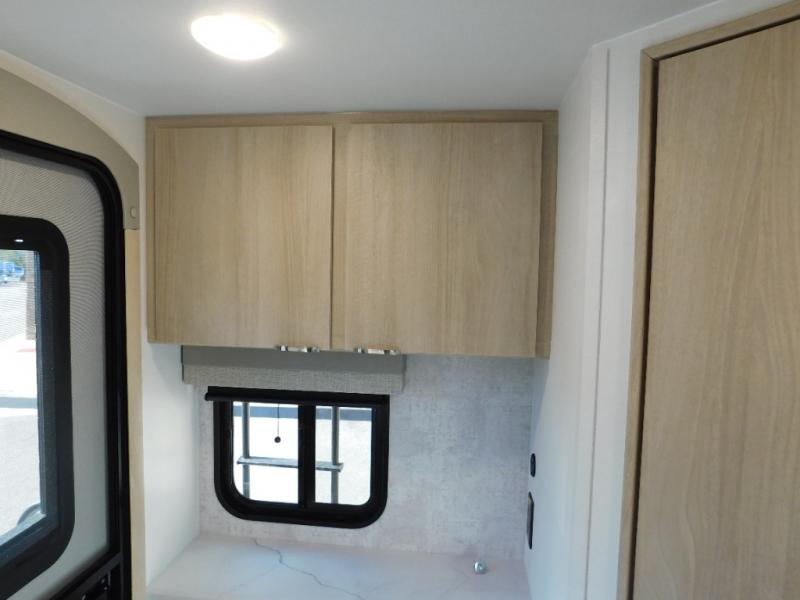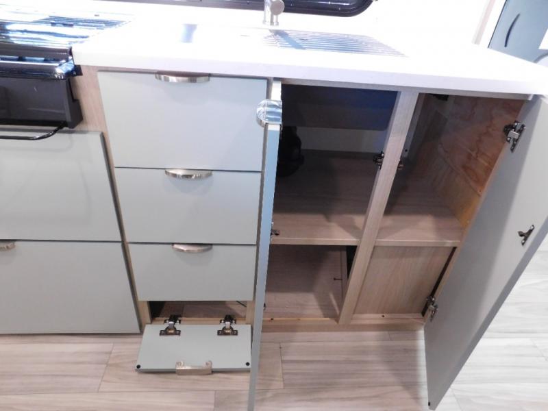 Two-burner cooktop, convection microwave, and 10.3 cu. ft. 12V refrigerator offer full kitchen functionality in a compact footprint.