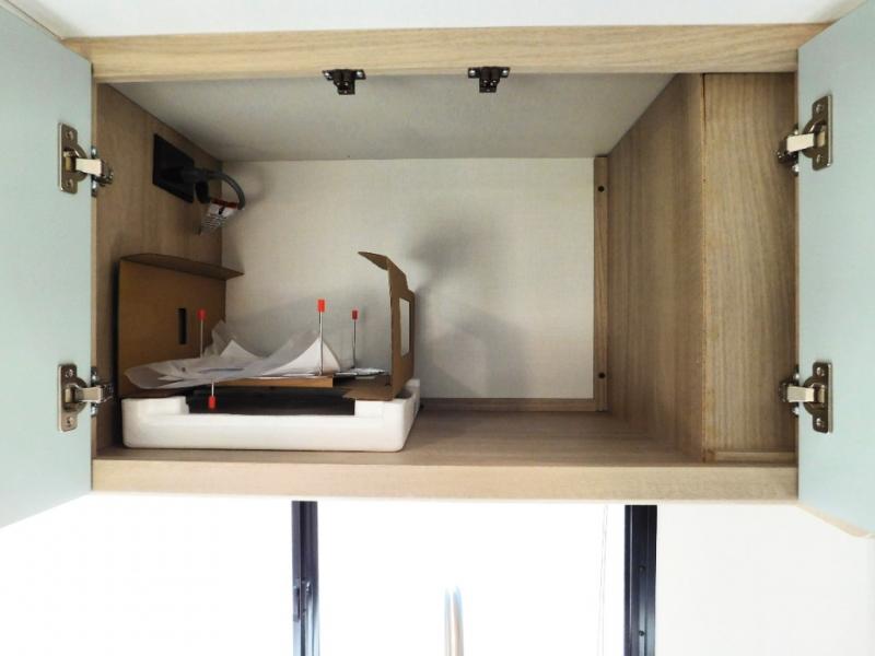 Built-in pantry cabinet keeps snacks and ingredients organized and accessible.