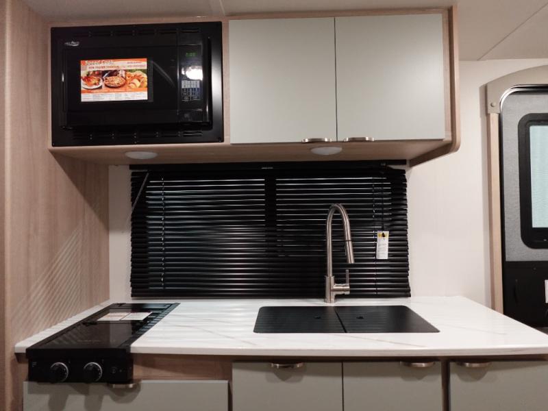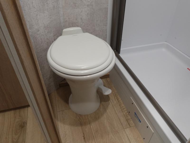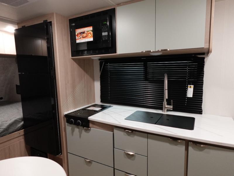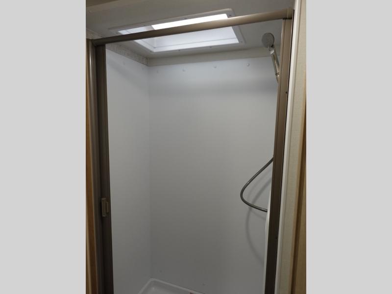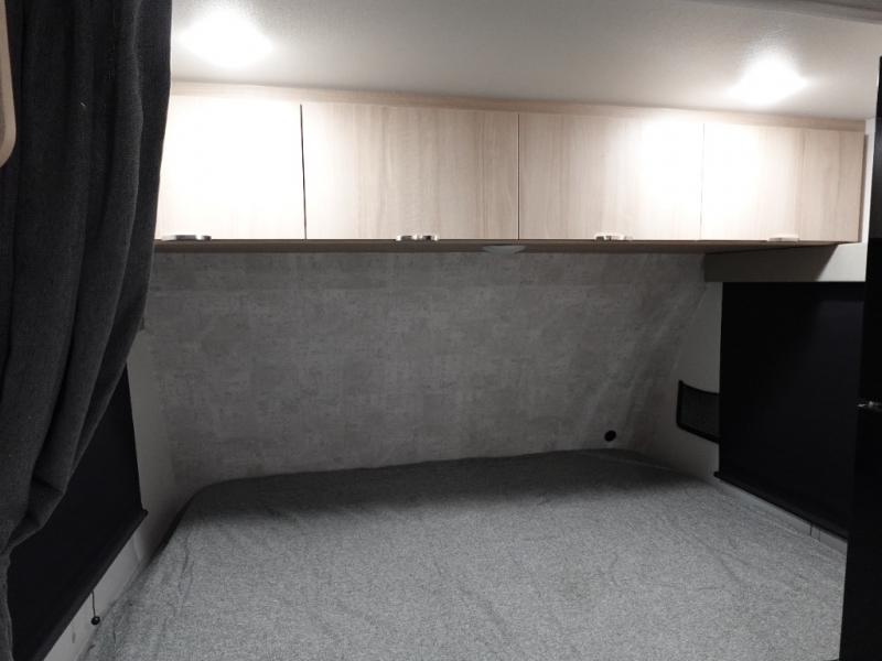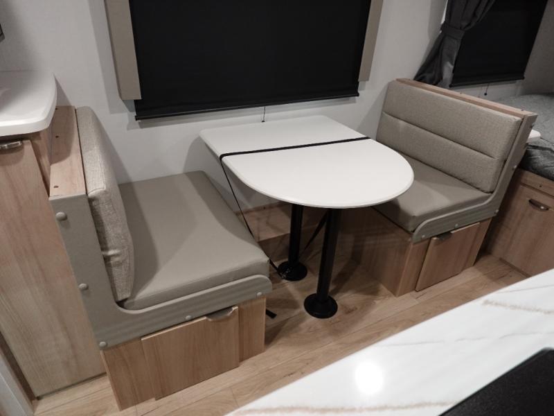 You will love this efficient floorplan that has everything you need! The front 54" x 74" full-size bed provides a great place to sleep after a long day of adventure. The galley kitchen is well-equipped for meals and includes a flip-up counter extension that will expand your work space or can be stowed away for more room. A pantry cabinet provides additional storage space. After cooking, you can enjoy dining at the spacious 74" x 32" booth dinette. A rear corner bath with angled entry door fits in a roomy 24" x 36" shower plus a fold down sink.
