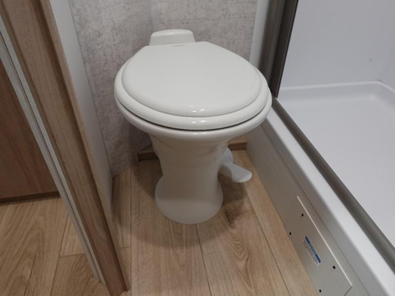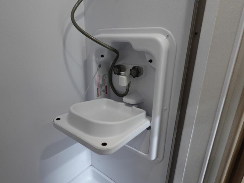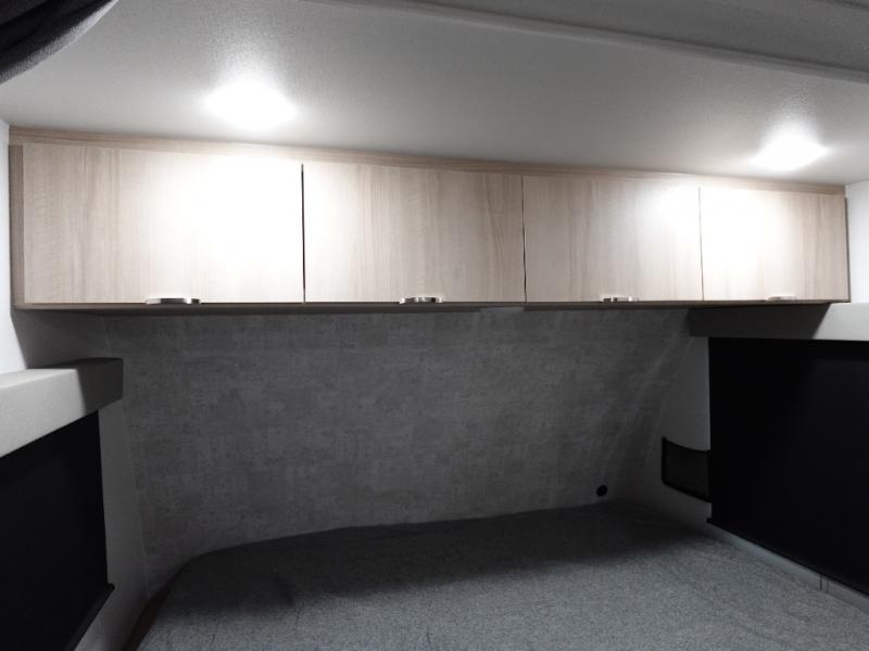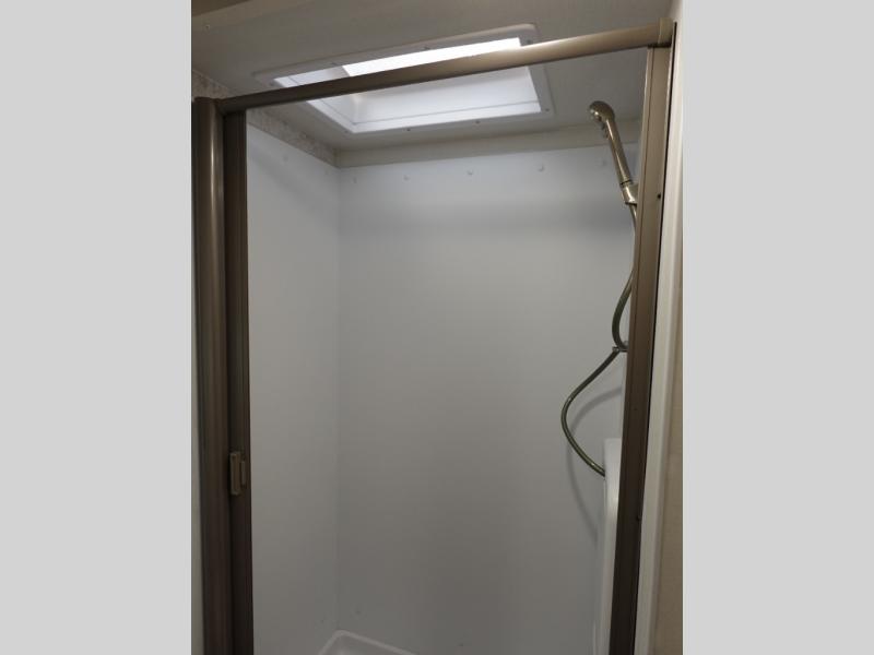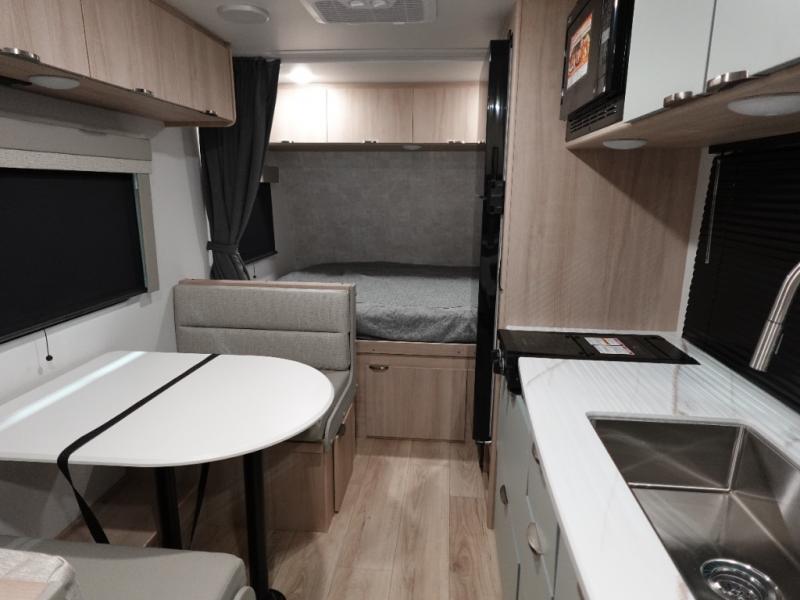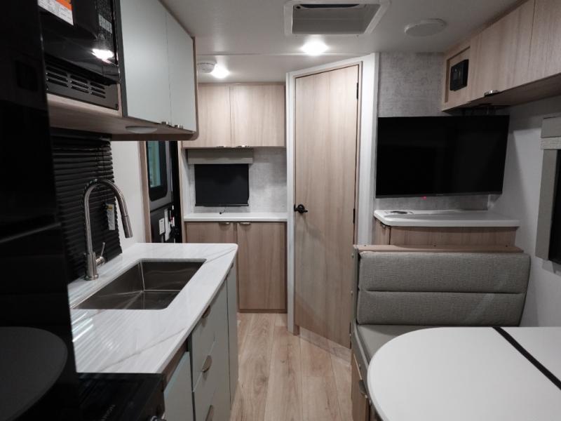 You will love this efficient floorplan that has everything you need! The front 54" x 74" full-size bed provides a great place to sleep after a long day of adventure. The galley kitchen is well-equipped for meals and includes a flip-up counter extension that will expand your work space or can be stowed away for more room. A pantry cabinet provides additional storage space. After cooking, you can enjoy dining at the spacious 74" x 32" booth dinette. A rear corner bath with angled entry door fits in a roomy 24" x 36" shower plus a fold down sink.