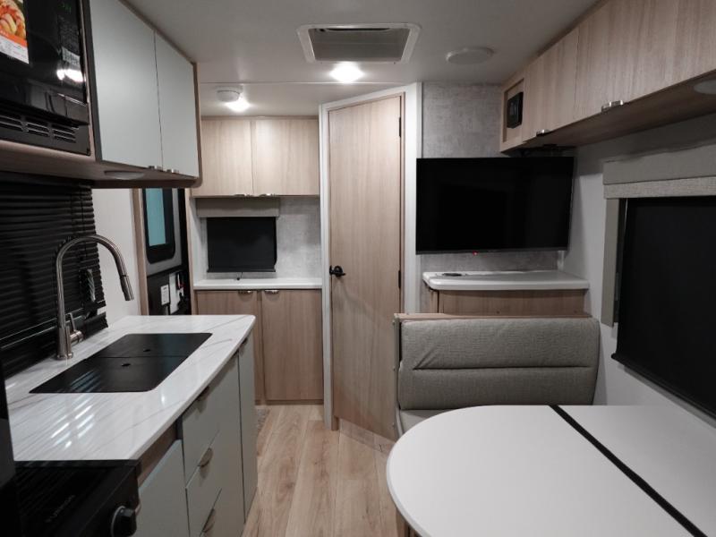 You will love this efficient floorplan that has everything you need! The front 54" x 74" full-size bed provides a great place to sleep after a long day of adventure. The galley kitchen is well-equipped for meals and includes a flip-up counter extension that will expand your work space or can be stowed away for more room. A pantry cabinet provides additional storage space. After cooking, you can enjoy dining at the spacious 74" x 32" booth dinette. A rear corner bath with angled entry door fits in a roomy 24" x 36" shower plus a fold down sink.