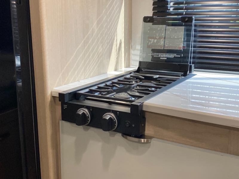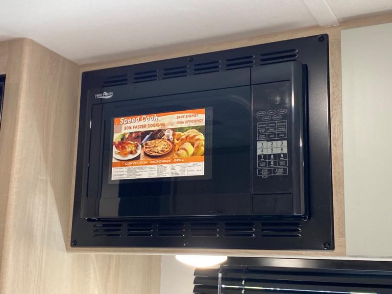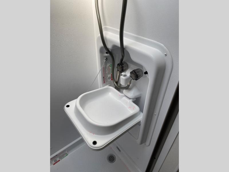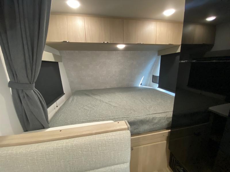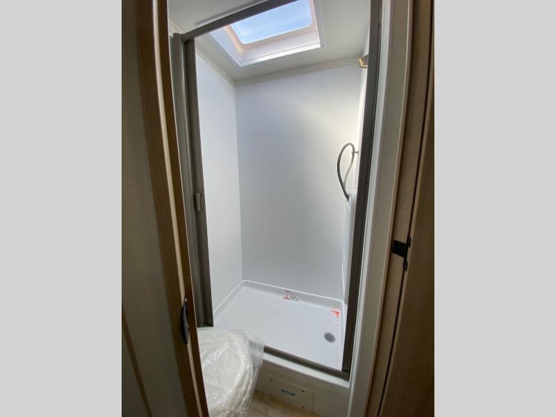 You will love this efficient floorplan that has everything you need! The front 54" x 74" full-size bed provides a great place to sleep after a long day of adventure. The galley kitchen is well-equipped for meals and includes a flip-up counter extension that will expand your work space or can be stowed away for more room. A pantry cabinet provides additional storage space. After cooking, you can enjoy dining at the spacious 74" x 32" booth dinette. A rear corner bath with angled entry door fits in a roomy 24" x 36" shower plus a fold down sink.