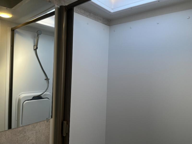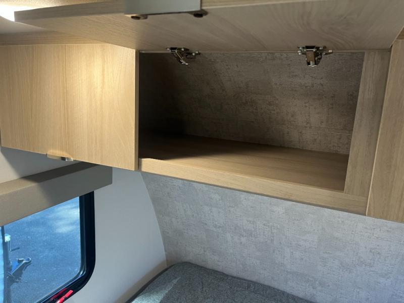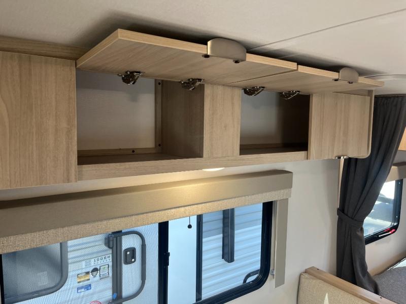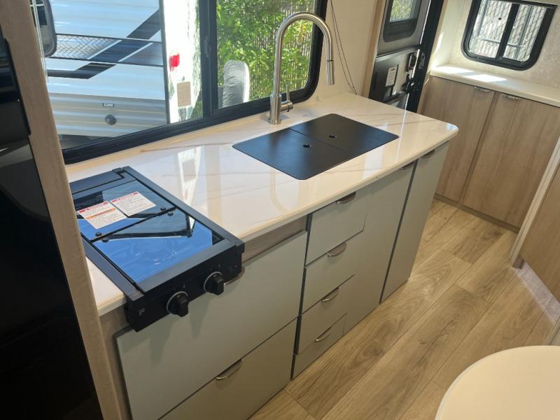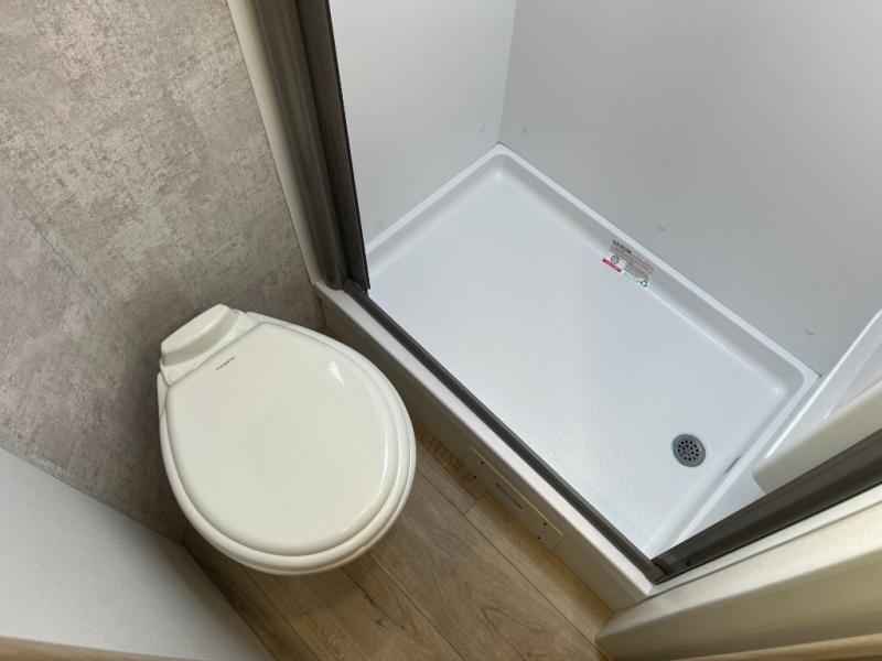You will love this efficient floorplan that has everything you need! The front 54" x 74" full-size bed provides a great place to sleep after a long day of adventure. The galley kitchen is well-equipped for meals and includes a flip-up counter extension that will expand your work space or can be stowed away for more room. A pantry cabinet provides additional storage space. After cooking, you can enjoy dining at the spacious 74" x 32" booth dinette. A rear corner bath with angled entry door fits in a roomy 24" x 36" shower plus a fold down sink.