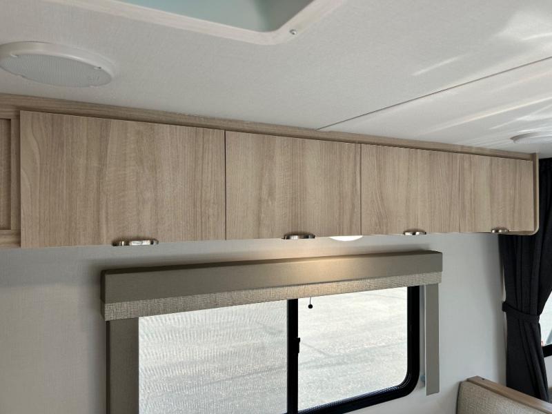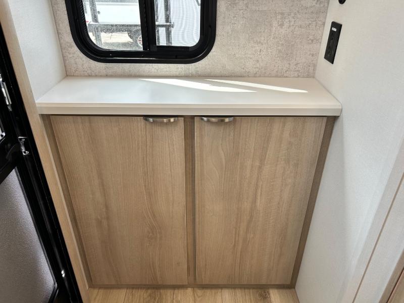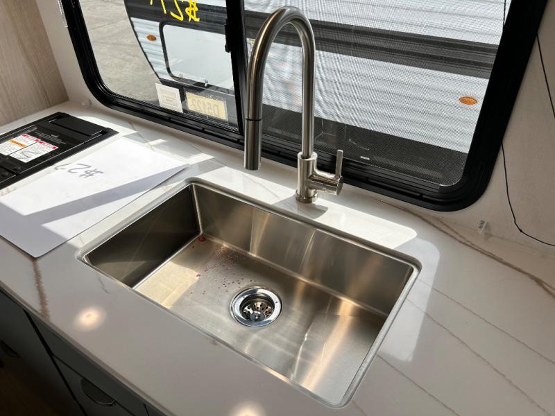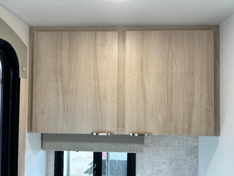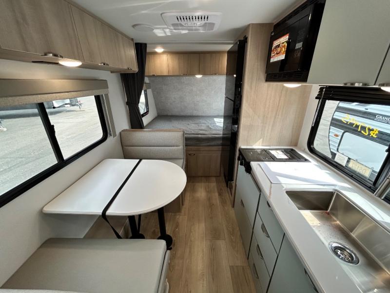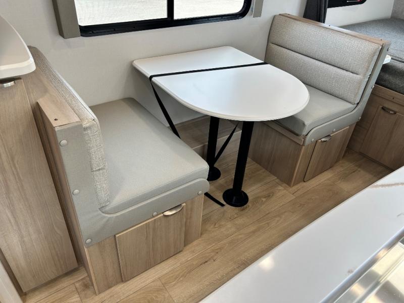 You will love this efficient floorplan that has everything you need! The front 54" x 74" full-size bed provides a great place to sleep after a long day of adventure. The galley kitchen is well-equipped for meals and includes a flip-up counter extension that will expand your work space or can be stowed away for more room. A pantry cabinet provides additional storage space. After cooking, you can enjoy dining at the spacious 74" x 32" booth dinette. A rear corner bath with angled entry door fits in a roomy 24" x 36" shower plus a fold down sink.