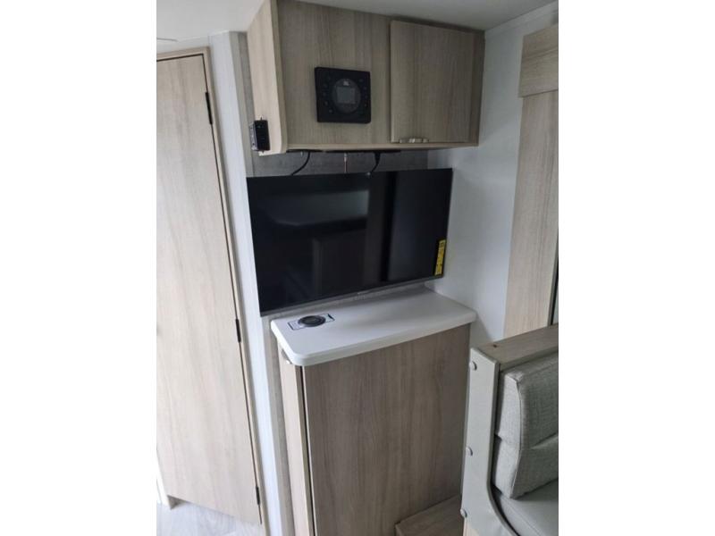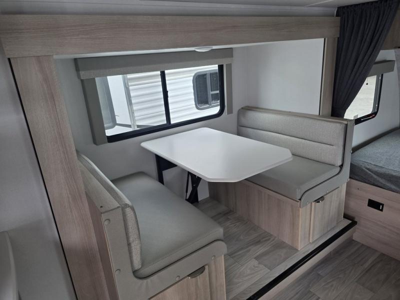 Don't pass your chance to camp comfortably with your spouse in this travel trailer! Up front there is a 54" x 74" full-size bed for a great night's rest. Scramble up some eggs with the three burner cooktop and grab a cup of orange juice from the 10.3 cu. ft. refrigerator then head to the 44" x 72" booth dinette slide to enjoy your meal. The dinette can also transforms into an extra sleeping space if you want a tag along guest. Everyone can freshen up in the rear corner bathroom and watch their favorite movies on the Smart TV!
