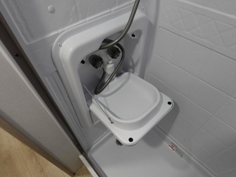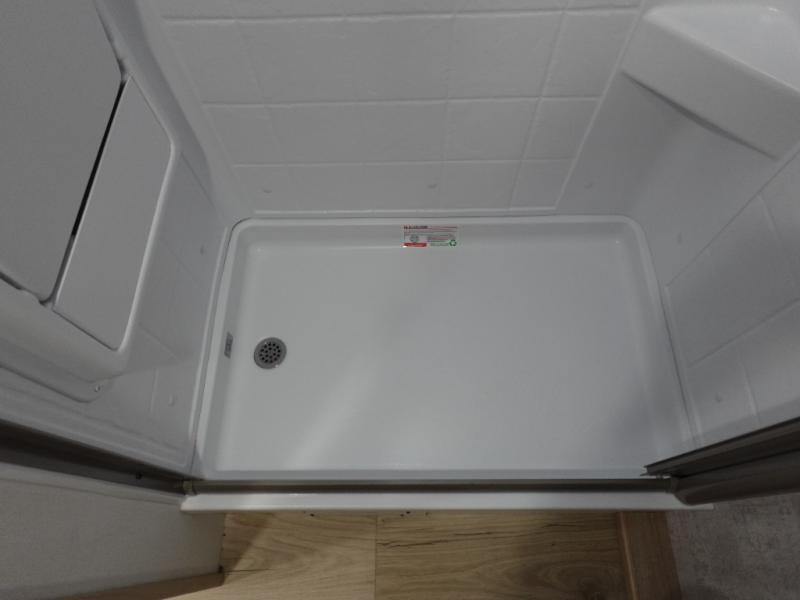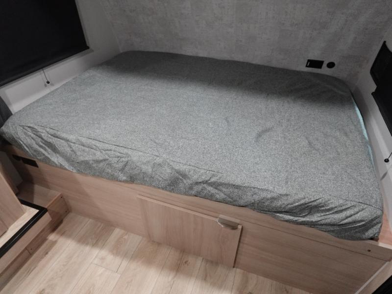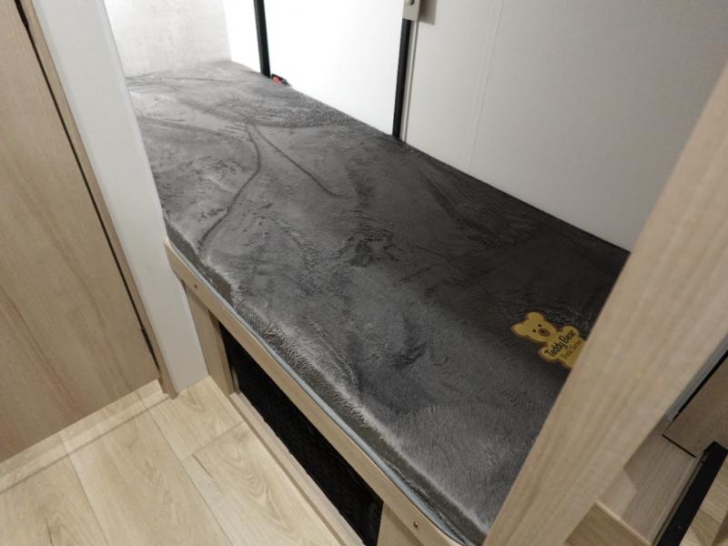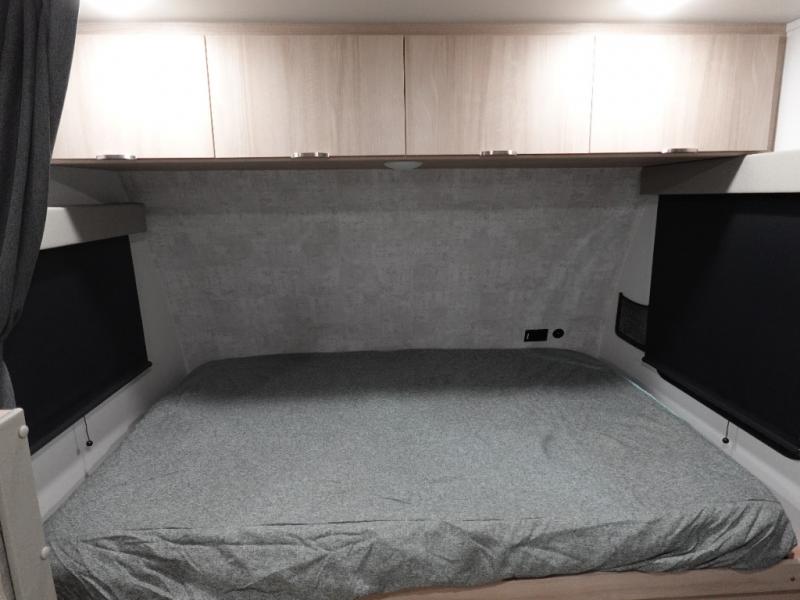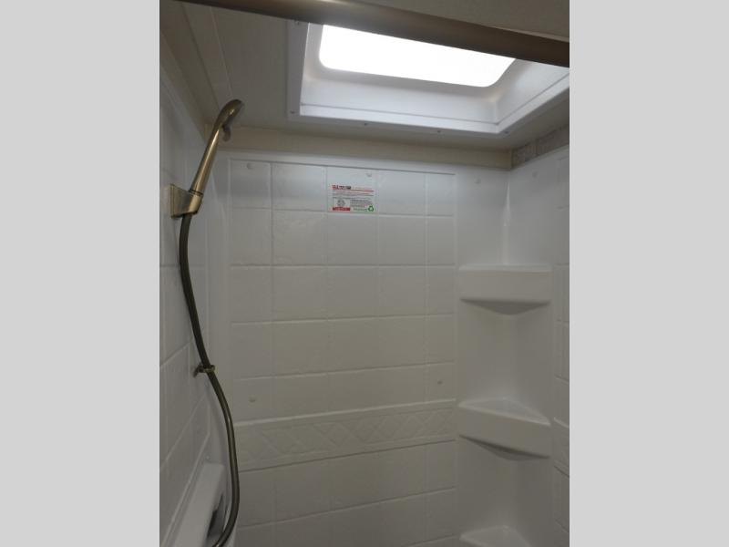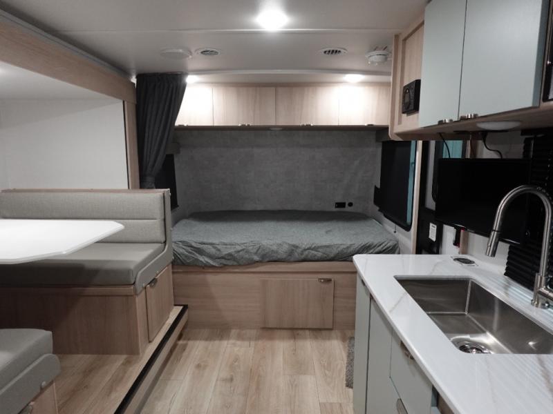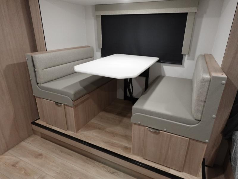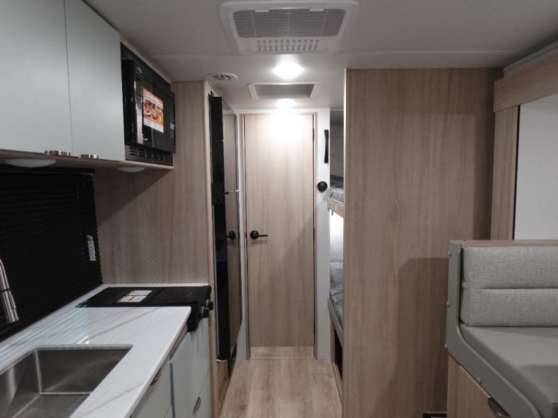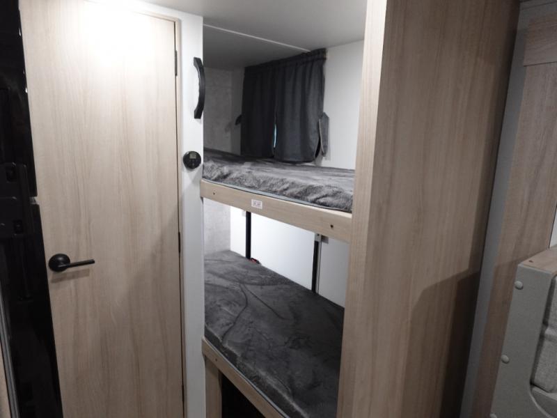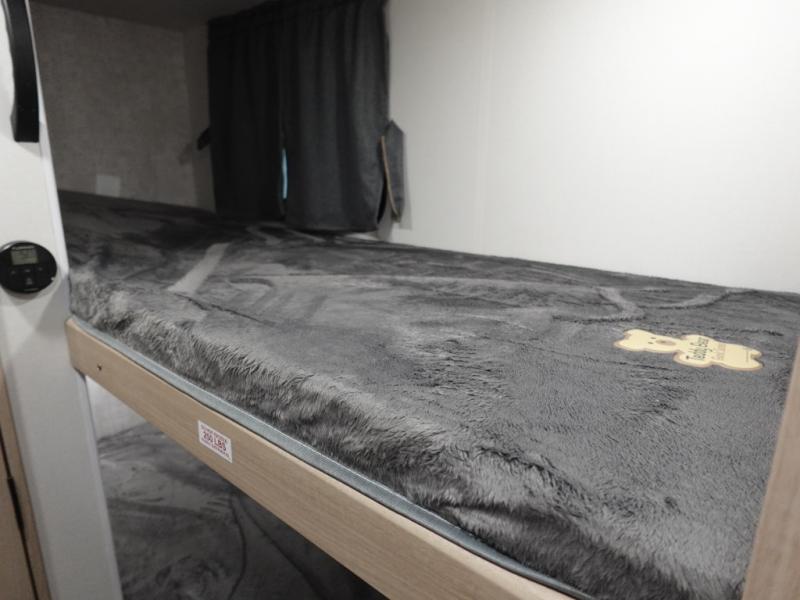 Get ready for a fun family weekend in the great outdoors with this trailer only steps away to enjoy inside comforts! The cook will love having everything to make warm meals, and can easily store leftovers in the 10.3 cu. ft. 12V refrigerator, plus the flip-up counter gives them more space to prep or dry the dishes. The front 54" x 74" full bed has a divider curtain for privacy at night and the rear corner 28" x 72" bunk beds are conveniently next to the private toilet and shower room. The booth dinette slide gives you a place to dine as well as sleep one more person, plus you will love the extra floor space that it provides.