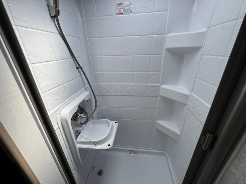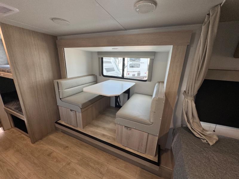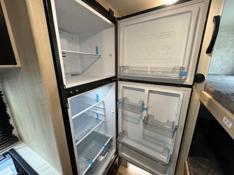 Get ready for a fun family weekend in the great outdoors with this trailer only steps away to enjoy inside comforts! The cook will love having everything to make warm meals, and can easily store leftovers in the 10.3 cu. ft. 12V refrigerator, plus the flip-up counter gives them more space to prep or dry the dishes. The front 54" x 74" full bed has a divider curtain for privacy at night and the rear corner 28" x 72" bunk beds are conveniently next to the private toilet and shower room. The booth dinette slide gives you a place to dine as well as sleep one more person, plus you will love the extra floor space that it provides. You might like to choose the EZ Glide Sofa Sleeper and table option in its place, the option is yours!