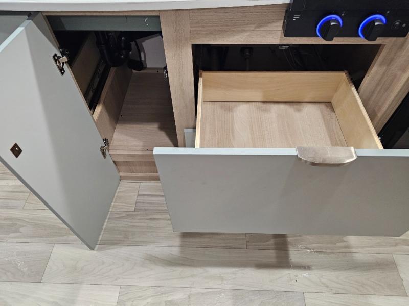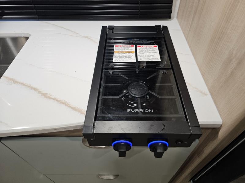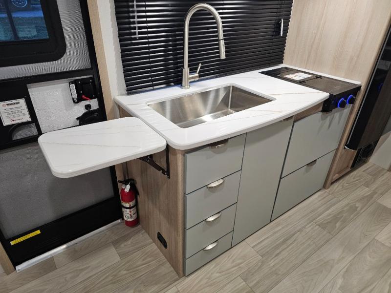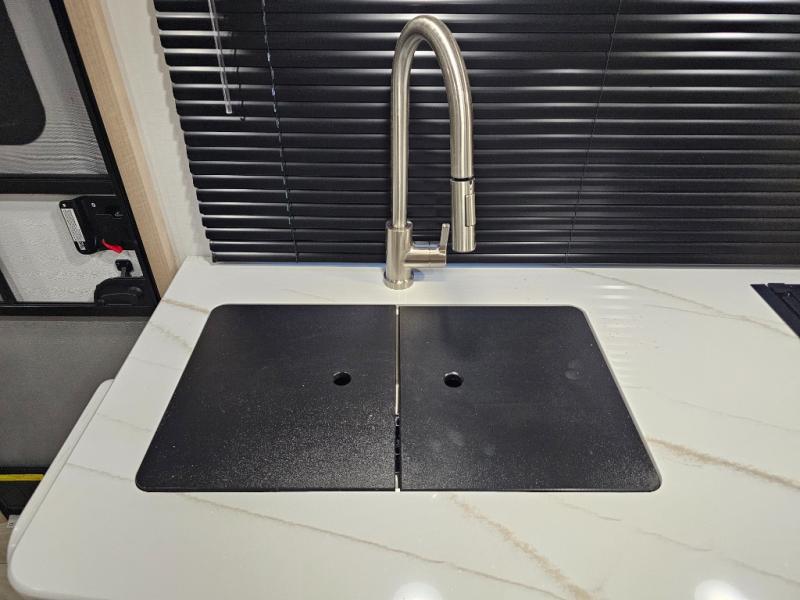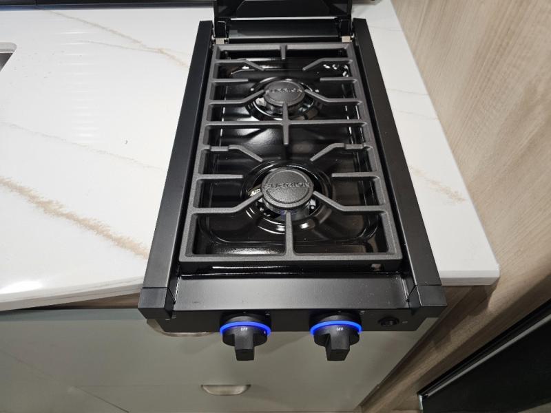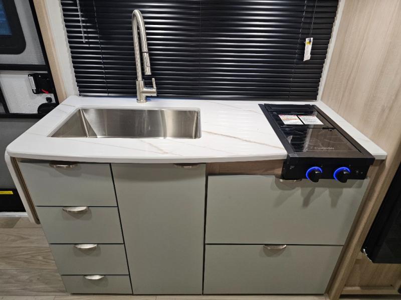 Two-burner cooktop, convection microwave, and stainless steel sink