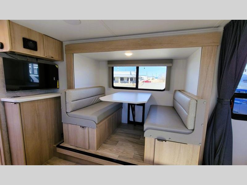 If you're looking for versatility then you need this travel trailer! Depending on the time of day you enter will determine whether you see the Murphy bed or the sofa up front. A slide out 44" x 72" booth dinette can be used for dining, playing games, and sleeping space at night. The full rear bathroom is equipped with everything you will need to freshen up each morning and features a wardrobe for your clothing and linens, and a pocket door into the bath saves space in the main room. The Smart TV is conveniently located so you can watch your favorite shows from the sofa or Murphy bed as well as the dinette, plus the pantry offers a place to store your snacks and such for easy access. The cook in your bunch will love all the amenities to make meals including the handy flip-up counter for more prep space.