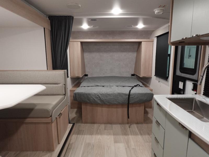 Pack your bags and head to the campground with this travel trailer! You will love all that it has to offer from the full rear bathroom to the front 60" x 74" RV queen-size bed with dual wardrobes on either side of the bed. The 44" x 72" booth dinette slide is not only a great place to enjoy your meals at or play card games, but it can also be transformed into an extra sleeping space if you want to bring along a guest. When you don't feel like making dinner, you can easily pop in some leftovers or a bag of popcorn into the convection microwave and relax while you watch a movie on the Smart TV!