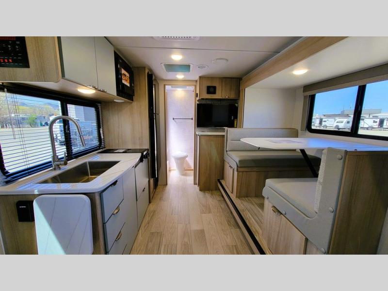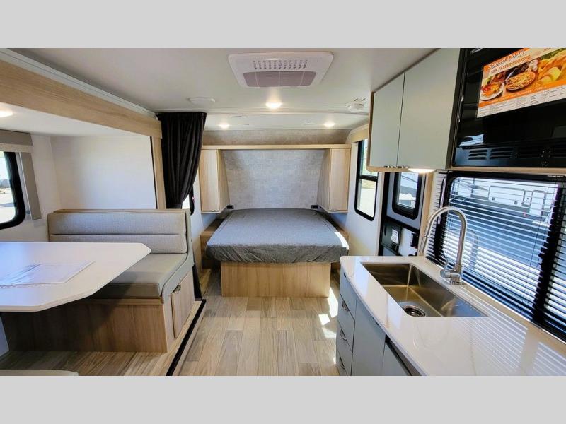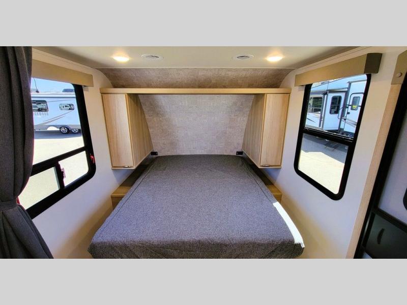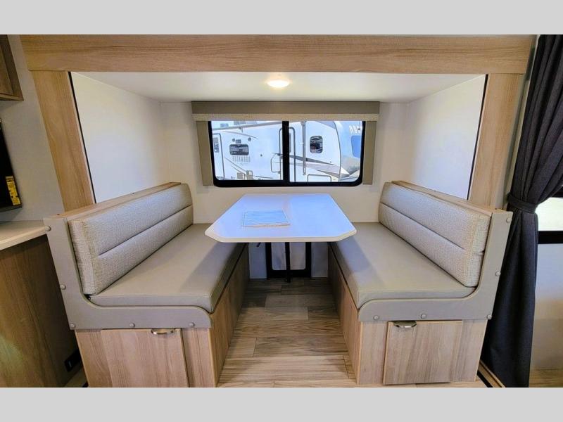 Pack your bags and head to the campground with this travel trailer! You will love all that it has to offer from the full rear bathroom to the front 60" x 74" RV queen-size bed with dual wardrobes on either side of the bed. The 44" x 72" booth dinette slide is not only a great place to enjoy your meals at or play card games, but it can also be transformed into an extra sleeping space if you want to bring along a guest. When you don't feel like making dinner, you can easily pop in some leftovers or a bag of popcorn into the convection microwave and relax while you watch a movie on the Smart TV!