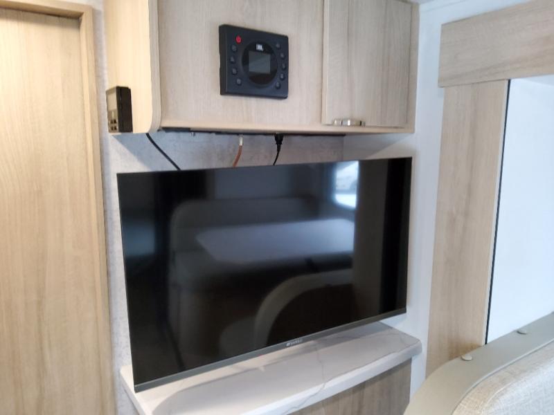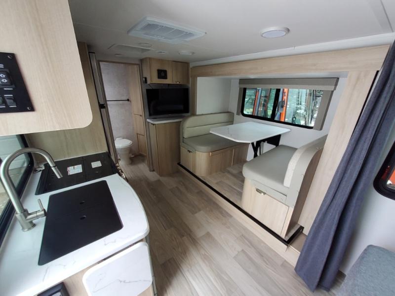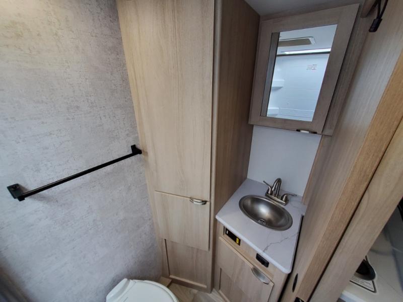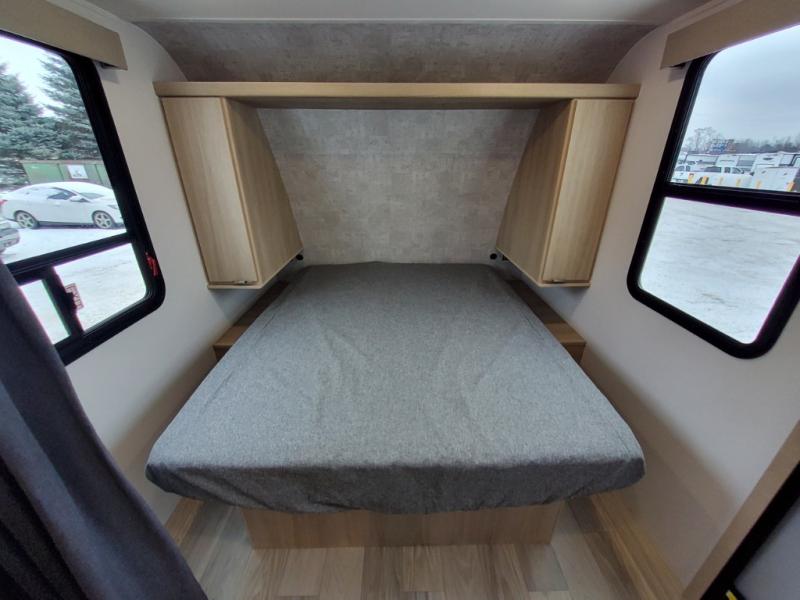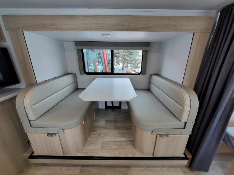 Pack your bags and head to the campground with this travel trailer! You will love all that it has to offer from the full rear bathroom to the front 60" x 74" RV queen-size bed with dual wardrobes on either side of the bed. The 44" x 72" booth dinette slide is not only a great place to enjoy your meals at or play card games, but it can also be transformed into an extra sleeping space if you want to bring along a guest. When you don't feel like making dinner, you can easily pop in some leftovers or a bag of popcorn into the convection microwave and relax while you watch a movie on the Smart TV!