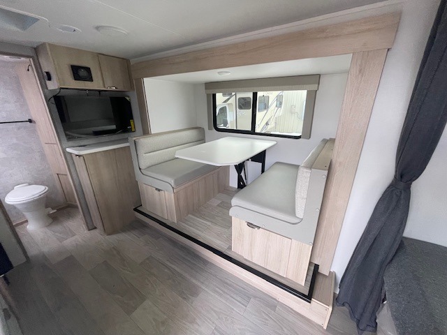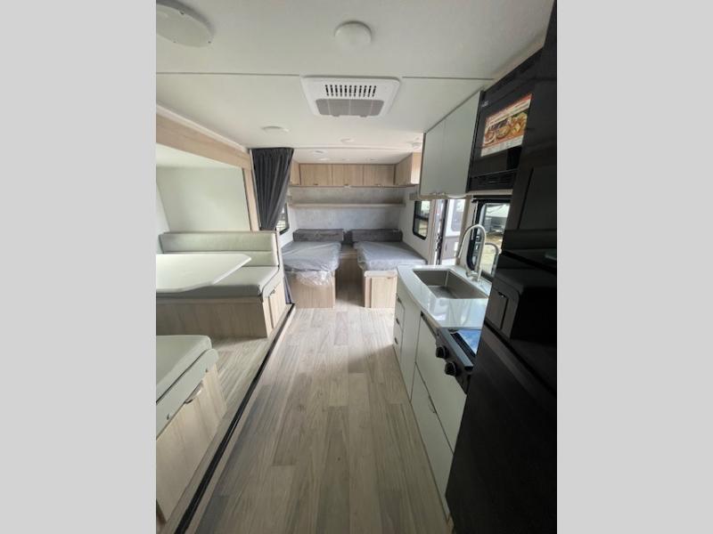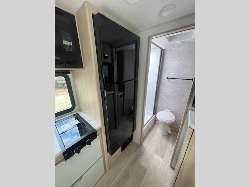 Come see just how accommodating this travel trailer can be! The two 32" x 74" twin beds up front have a nightstand in between them and a divider curtain to draw, plus they can convert into one 74" x 82" king-size bed. The 44" x 72" booth dinette slide can also convert into an extra sleeping space when you're not using it for meal time or playing games. Everyone can get squeaky clean in the full rear bathroom, and the wardrobe is a convenient place to store your linens and extra clothes. Grab a snack from the kitchen pantry or pop a bag of popcorn in the convection microwave then watch a movie on the Smart TV or head outdoors and relax underneath the power awning!