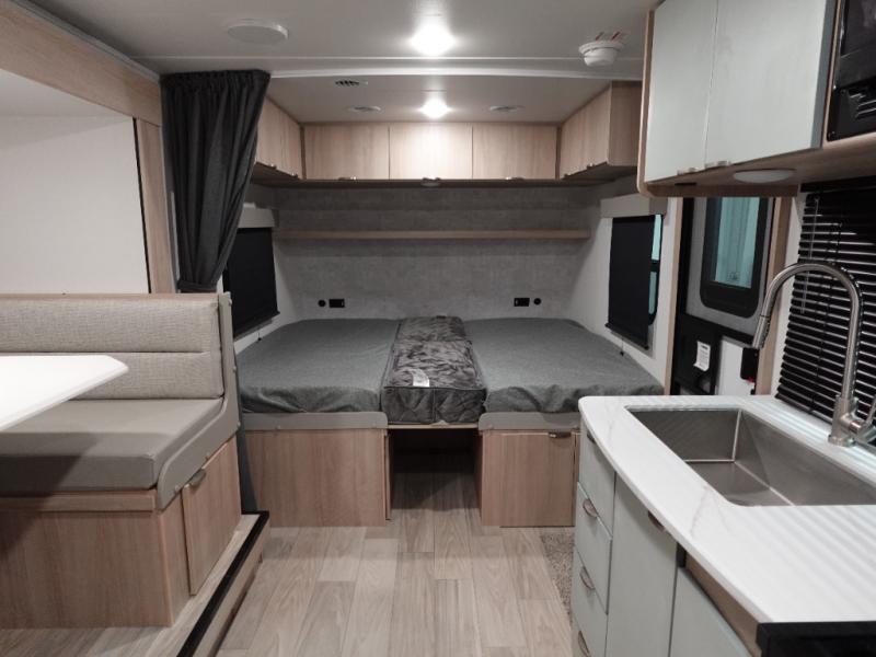 Come see just how accommodating this travel trailer can be! The two 32" x 74" twin beds up front have a nightstand in between them and a divider curtain to draw, plus they can convert into one 74" x 82" king-size bed. The 44" x 72" booth dinette slide can also convert into an extra sleeping space when you're not using it for meal time or playing games. Everyone can get squeaky clean in the full rear bathroom, and the wardrobe is a convenient place to store your linens and extra clothes. Grab a snack from the kitchen pantry or pop a bag of popcorn in the convection microwave then watch a movie on the Smart TV or head outdoors and relax underneath the power awning!