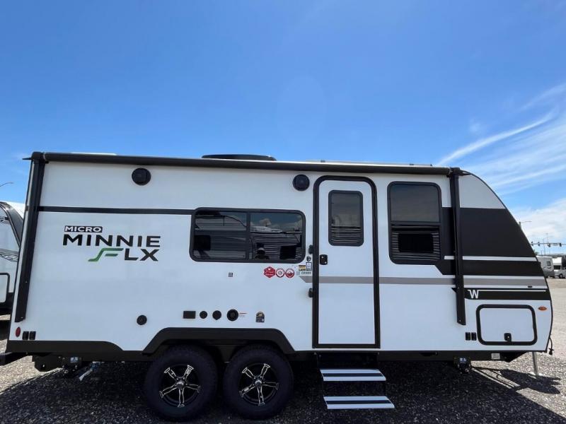 Every inch of the Winnebago Micro Minnie FLX travel trailer is worth checking out! These trailers are built with an NXG engineered frame, 1.5" thick FILON MAX fiberglass sidewalls with Azdel Onboard, plus larger off-road tires for easy towing. The FLX System includes four integrated technologies that will allow you to go off grid for up to five days without the need for a generator or external hookups. Within this system, there are two 200-watt solar panels, a 320-amp-hour Lithionics lithium-ion battery, a 3,000-watt pure sine wave inverter, plus a Truma AquaGo Comfort+ water heater and VarioHeat furnace which extends your water supply by providing instant hot water to faucets and your shower. You will love the interior with full-overlay European style cabinetry, versatile sleeping arrangements, a spacious full bath, and generous storage space for camp gear, personal belongings, and more!