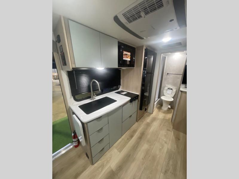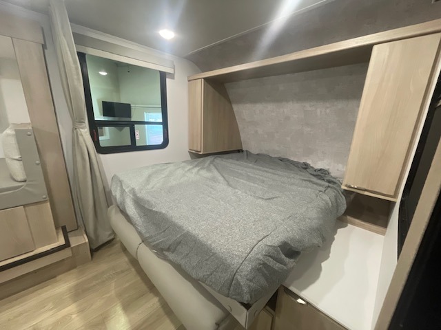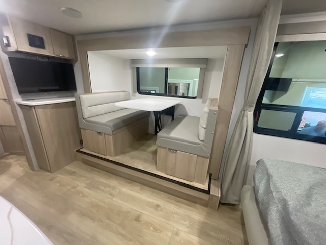This Micro Minnie FLX travel trailer will be an amazing addition to your upcoming travel plans! You will have extra space on the interior thanks to the single slide, and the front Murphy bed can fold away to reveal a sofa for lounging during the day. There also dual wardrobes and dual nightstands so everything has a place to go. The kitchen comes equipped with a convection microwave, recessed three-burner cooktop, 10 cu. ft. 12V refrigerator, and flip-up countertop. You also have the ability to switch out the dinette for the optional EZ Glide sofa sleeper with a hutch and table.