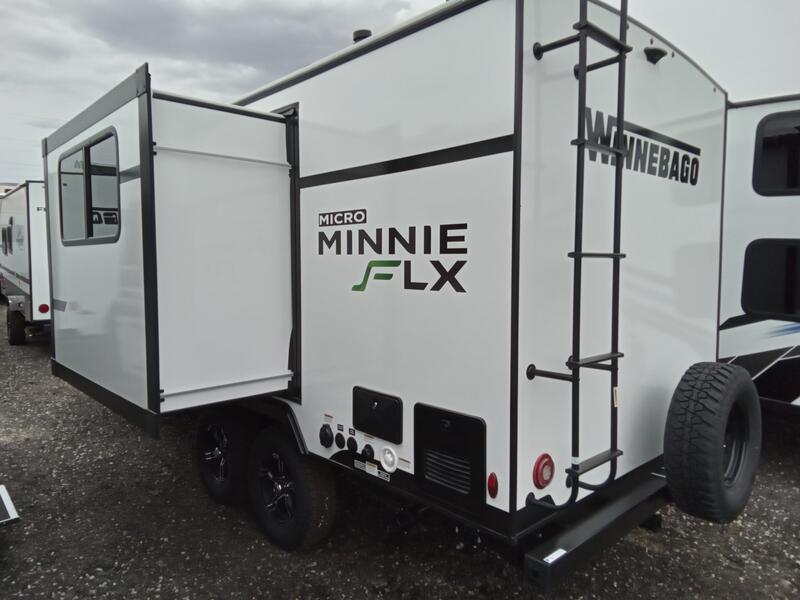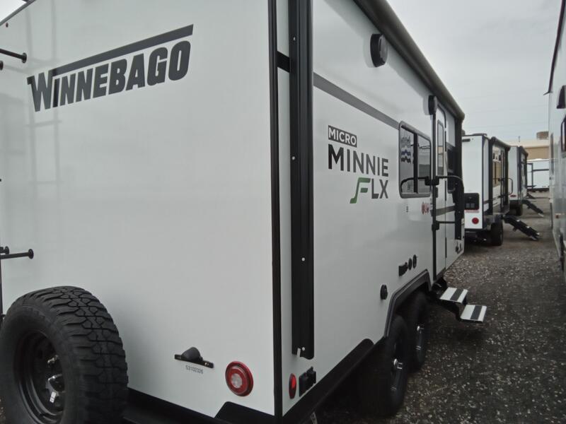 Every inch of the Winnebago Micro Minnie FLX travel trailer is worth checking out! These trailers are built with an NXG engineered frame, 1.5" thick FILON MAX fiberglass sidewalls with Azdel Onboard, plus larger off-road tires for easy towing. The FLX System includes four integrated technologies that will allow you to go off grid for up to five days without the need for a generator or external hookups. Within this system, there are two 200-watt solar panels, a 320-amp-hour Lithionics lithium-ion battery, a 3,000-watt pure sine wave inverter, plus a Truma AquaGo Comfort+ water heater and VarioHeat furnace which extends your water supply by providing instant hot water to faucets and your shower. You will love the interior with full-overlay European style cabinetry, versatile sleeping arrangements, a spacious full bath, and generous storage space for camp gear, personal belongings, and more!