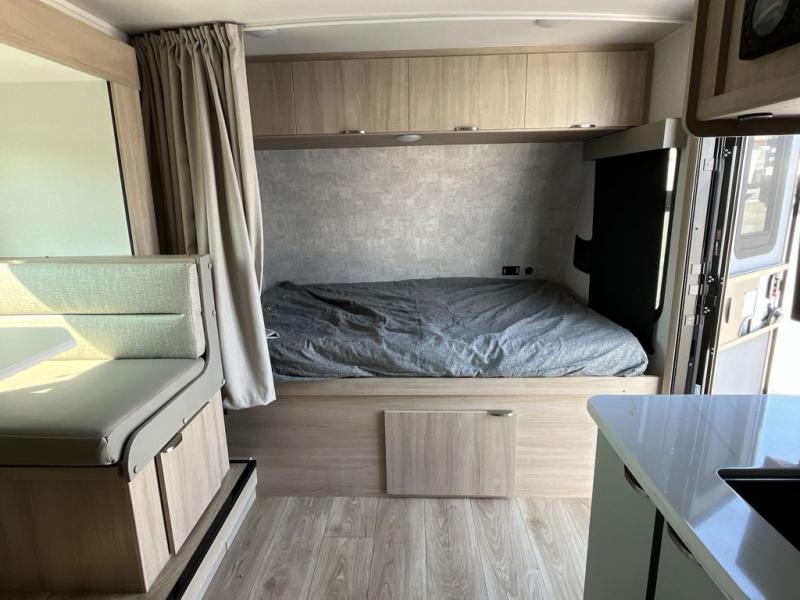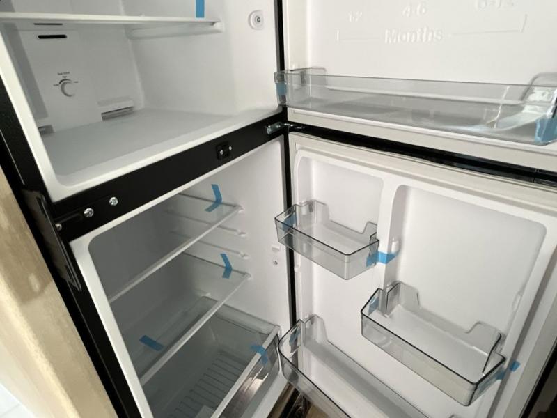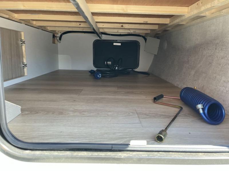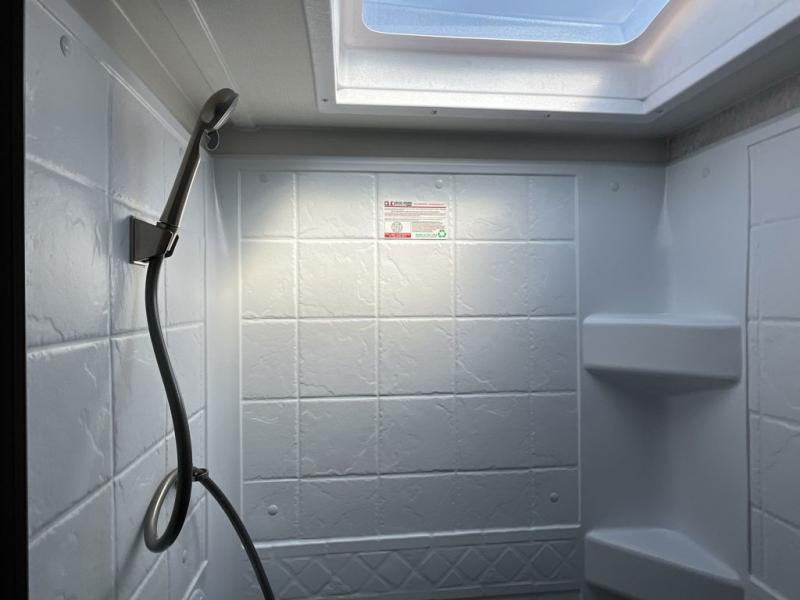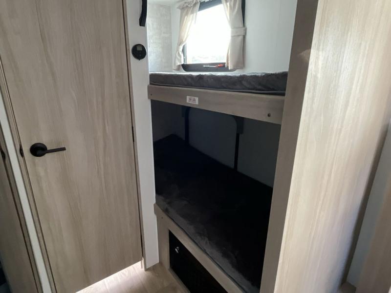 Get ready for a fun family weekend in the great outdoors with this trailer only steps away to enjoy inside comforts! The cook will love having everything to make warm meals, and can easily store leftovers in the 10.3 cu. ft. 12V refrigerator, plus the flip-up counter gives them more space to prep or dry the dishes. The front 54" x 74" full bed has a divider curtain for privacy at night and the rear corner 28" x 72" bunk beds are conveniently next to the private toilet and shower room. The booth dinette slide gives you a place to dine as well as sleep one more person, plus you will love the extra floor space that it provides. You might like to choose the EZ Glide Sofa Sleeper and table option in its place, the option is yours!