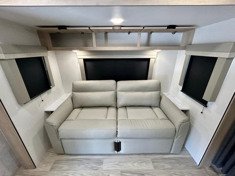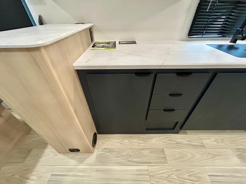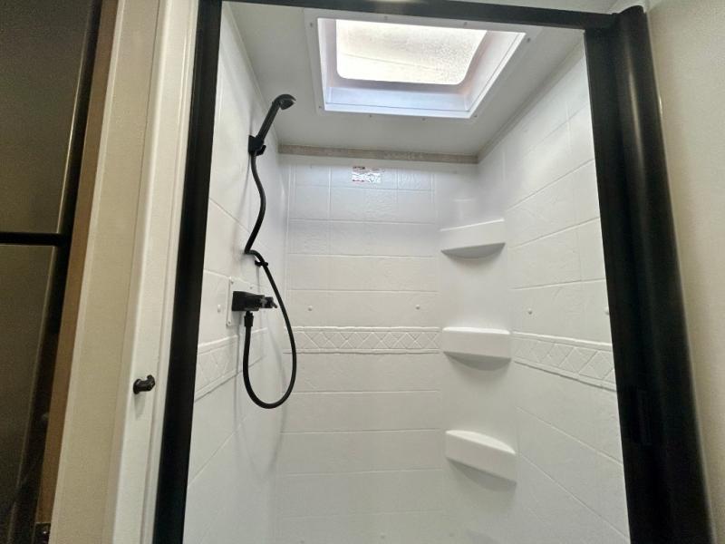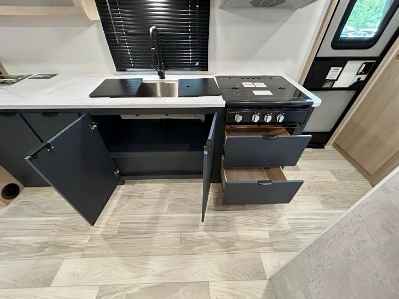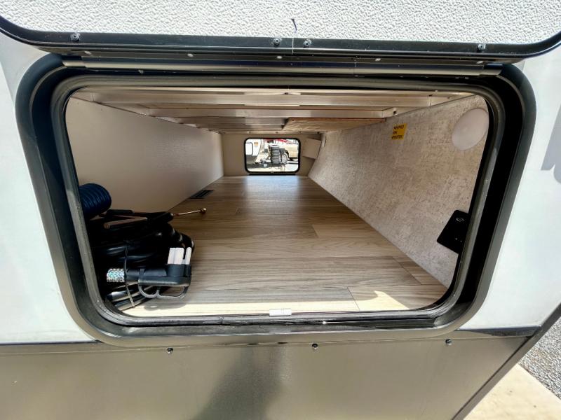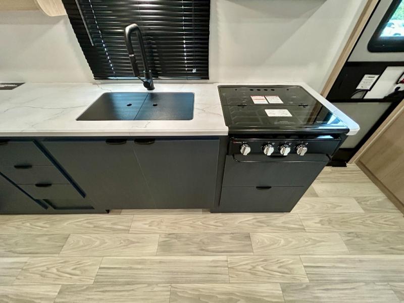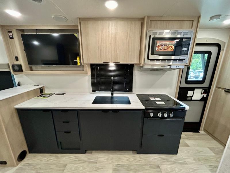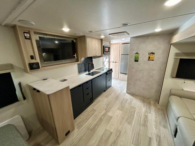 Pack your bags and head to your favorite camping spot in this travel trailer! You will get a good night's rest each night on the front queen bed with wardrobes on either side, and keep your bellies full with delicious meals prepared on the three burner cooktop. The kitchen also has a raised countertop with storage below it. After a fun day at the beach, you can freshen up in the rear corner bathroom with the 30" x 36" shower. The 72" sofa slide with table is a comfortable place to relax, unwind and enjoy a meal. You could also switch it out for an optional U-shaped dinette or optional theater seating!