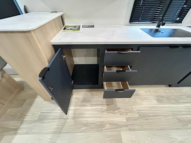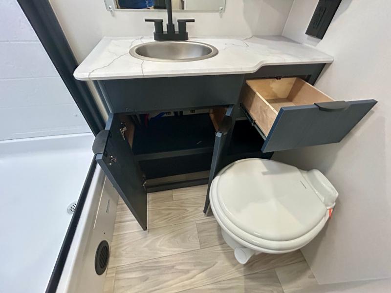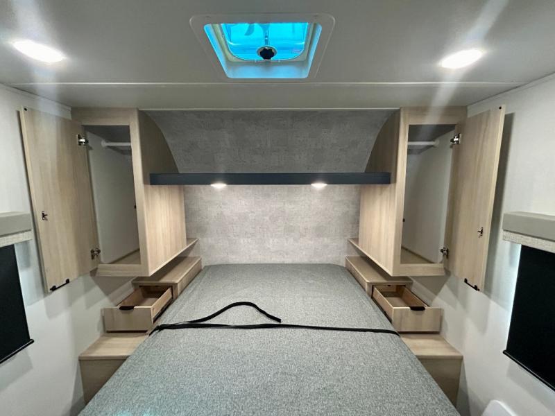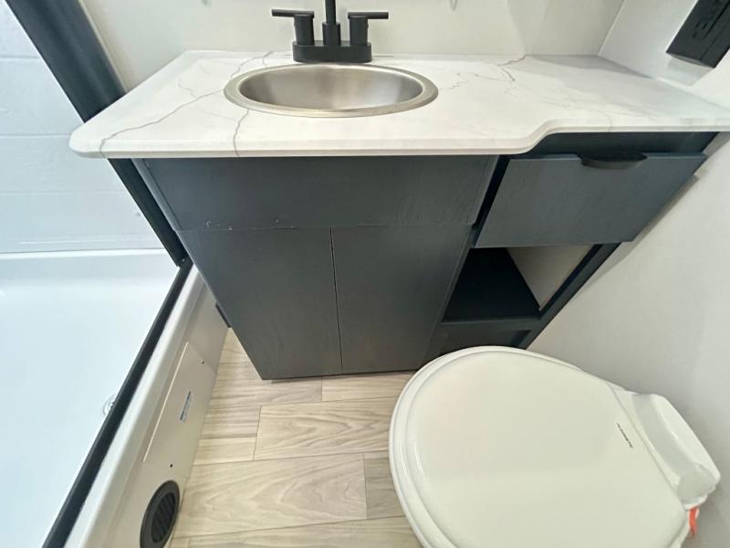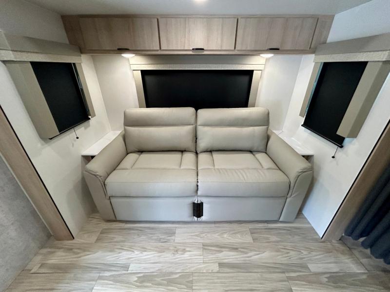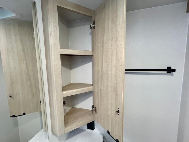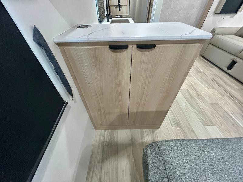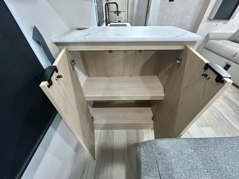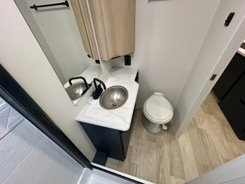 Pack your bags and head to your favorite camping spot in this travel trailer! You will get a good night's rest each night on the front queen bed with wardrobes on either side, and keep your bellies full with delicious meals prepared on the three burner cooktop. The kitchen also has a raised countertop with storage below it. After a fun day at the beach, you can freshen up in the rear corner bathroom with the 30" x 36" shower. The 72" sofa slide with table is a comfortable place to relax, unwind and enjoy a meal. You could also switch it out for an optional U-shaped dinette or optional theater seating!