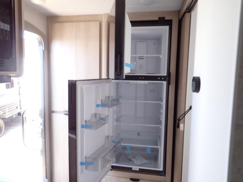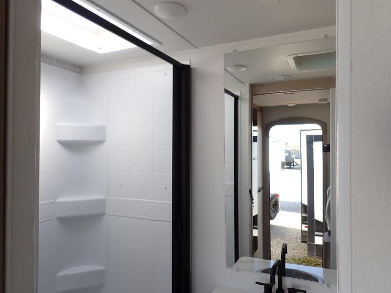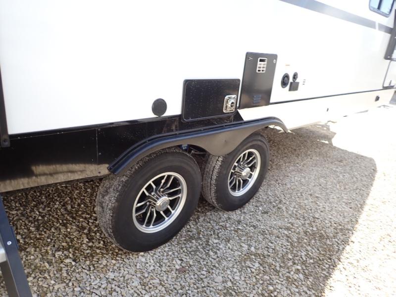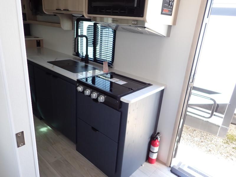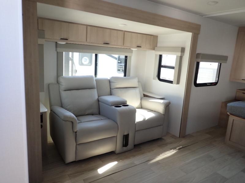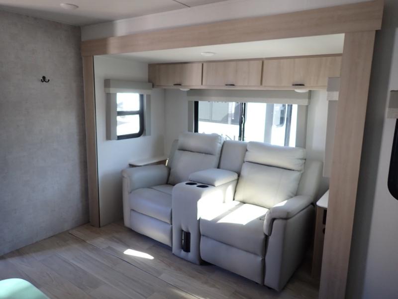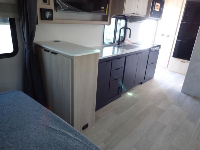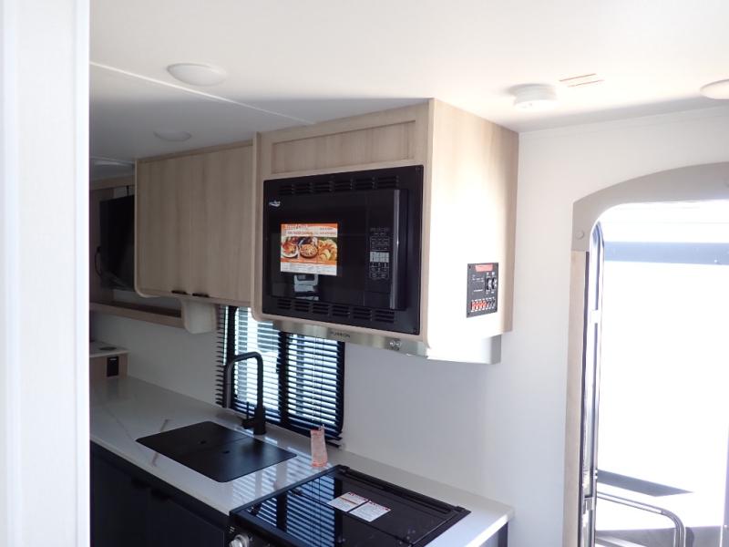 Pack your bags and head to your favorite camping spot in this travel trailer! You will get a good night's rest each night on the front queen bed with wardrobes on either side, and keep your bellies full with delicious meals prepared on the three burner cooktop. The kitchen also has a raised countertop with storage below it. After a fun day at the beach, you can freshen up in the rear corner bathroom with the 30" x 36" shower. The 72" sofa slide with table is a comfortable place to relax, unwind and enjoy a meal. You could also switch it out for an optional U-shaped dinette or optional theater seating!