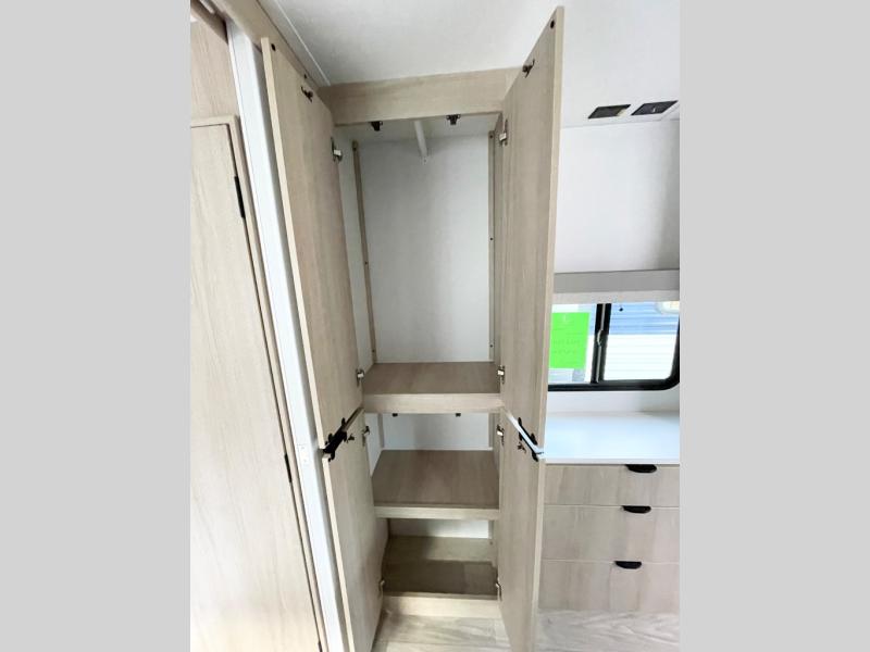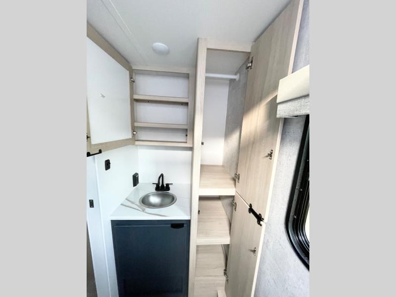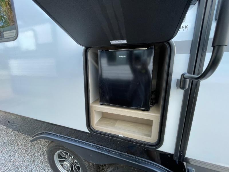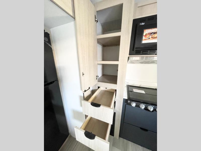 Adventure comfortably in this front kitchen Minnie travel trailer for two or four featuring a rear full bath for added convenience. All guests will appreciate a 30" x 36" shower, linen cabinet, and toilet all behind a space saving sliding door. Multiple seating and sleeping is available in the combined living and kitchen area featuring a large slide that houses a 72" tri-fold sofa with sofa table, and a 10 cu. ft. refrigerator. There is also a counter area with two stools for dining. The front kitchen offers a pantry for dry good storage, plenty of counter space, a three burner cooktop, convection microwave oven, and corner sink. Ample overhead storage provides space for your dishes and necessities. A second pantry is located just to the left of the main entry door. On the outside, there is a large pass-through storage compartment for your camp chairs, fishing poles, and outdoor games, plus a 1.6 cu. ft. outdoor refrigerator to keep cold drinks and snacks in.