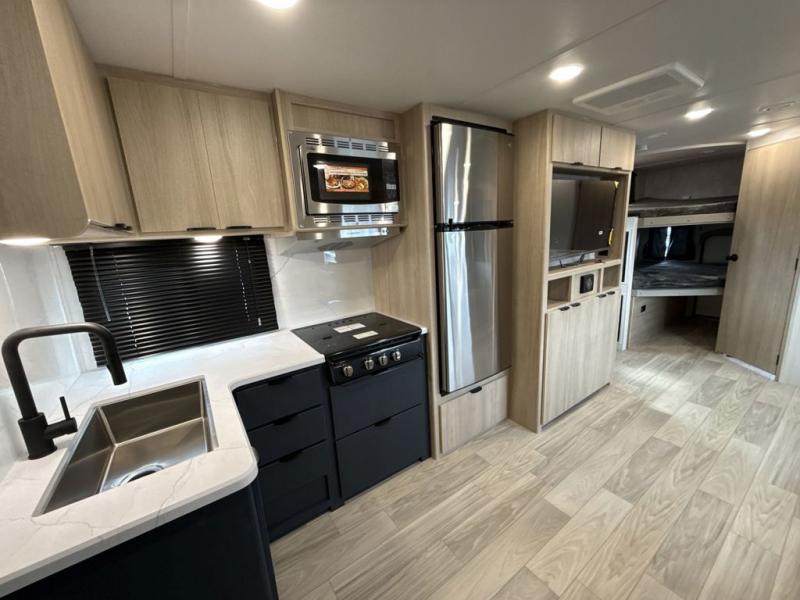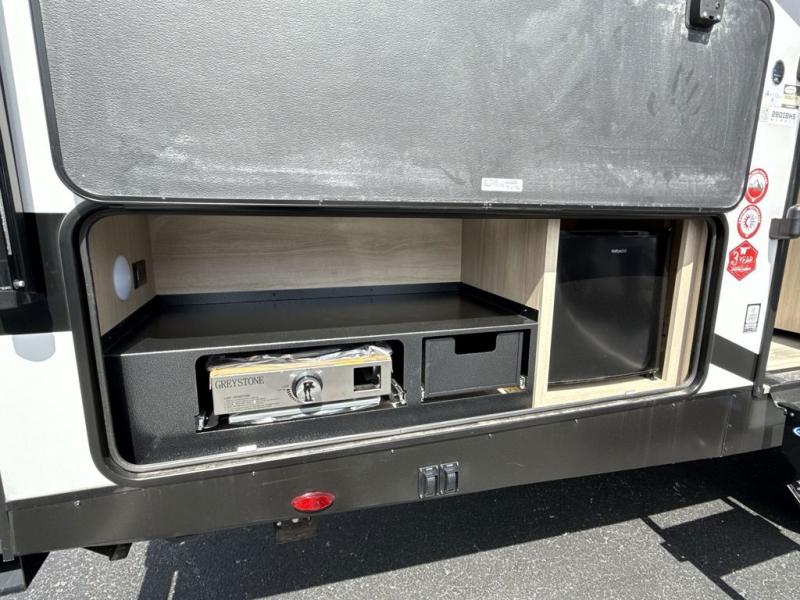 This model is similar to 2301BHS, but with a larger length and more seating space. Within the large slide out you'll find a tri-fold sofa and booth dinette to relax, dine, and sleep additional guests. The little ones are sure to love the double-size bunks, and there is a front private bedroom with a queen bed for you. The chef of your group can cook indoors on the three burner cooktop, or outdoors on the outside kitchen. And don't forget about all the storage space you'll find both indoors and outdoors!