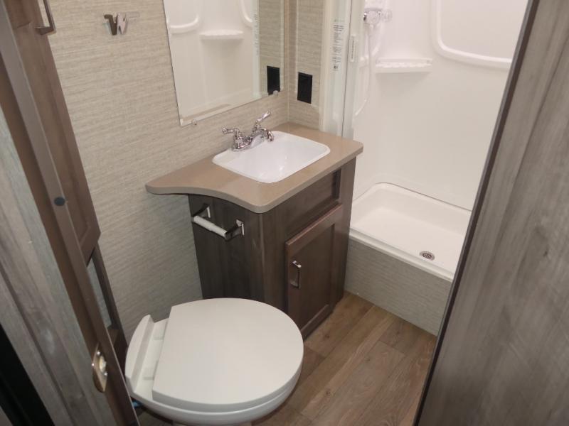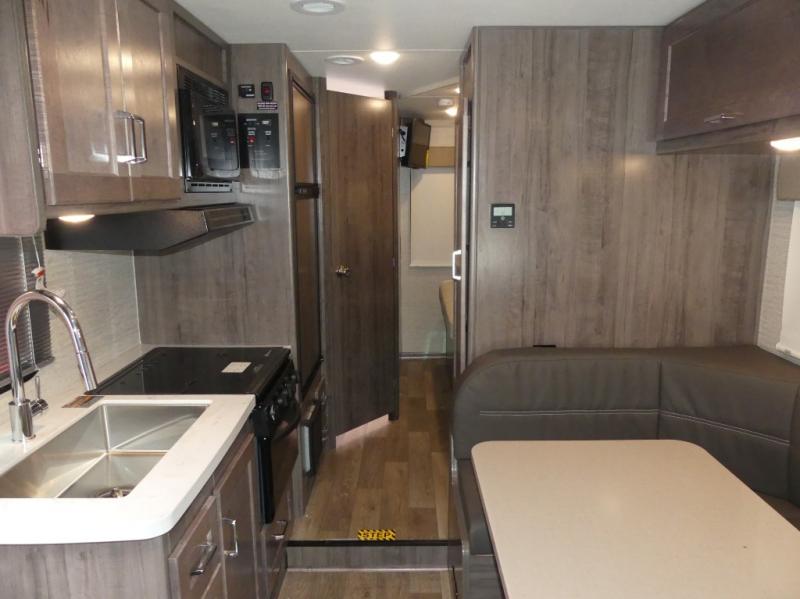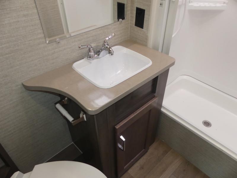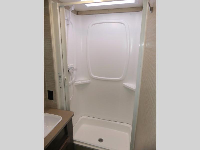Start living your best travel life in this motorhome! After a long day of traveling, enjoy a good night's rest on the 60" x 75" bed in the rear corner bedroom which also has a nightstand, a wardrobe to keep your clothes looking nice, and a 24" HDTV for your entertainment. If you have others who wish to join you, they can sleep on the 57" x 95" bunk over cab with a TV location or even on the 45" x 74" U-shaped dinette once converted. Don't worry about eating fast food while you travel either thanks to the three burner range with glass cover and oven and the two way double door 6.3 cu. ft. refrigerator/freezer with woodgrain paneling. Freshen up after a long day of traveling in the rear corner bathroom with the 23" x 34" shower with a retractable shower door and skylight above for added headroom and natural lighting!