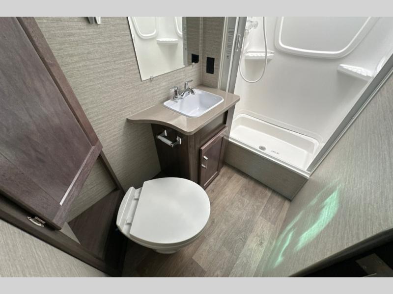 Start living your best travel life in this motorhome! After a long day of traveling, enjoy a good night's rest on the 60" x 75" bed in the rear corner bedroom which also has a nightstand, a wardrobe to keep your clothes looking nice, and a 24" HDTV for your entertainment. If you have others who wish to join you, they can sleep on the 57" x 95" bunk over cab with a TV location or even on the 45" x 74" U-shaped dinette once converted. Don't worry about eating fast food while you travel either thanks to the three burner range with glass cover and oven and the two way double door 6.3 cu. ft. refrigerator/freezer with woodgrain paneling. Freshen up after a long day of traveling in the rear corner bathroom with the 23" x 34" shower with a retractable shower door and skylight above for added headroom and natural lighting! This model is shown with the standard E450 chassis specs, but is also available with optional E350 chassis specs; see dealer for more details.