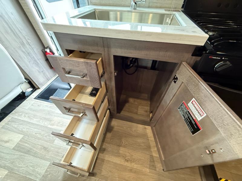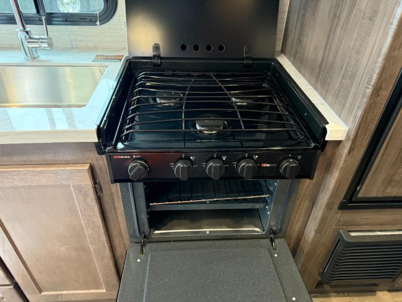 The fully equipped kitchen includes a 3-burner cooktop, microwave, refrigerator, and ample cabinet storage, making it easy to cook meals wherever your adventures take you.