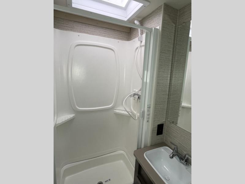 Pack your bags and load up into this motorhome for a fun vacation! You can lay your head down each night on the corner 54" x 80" bed with a 24" HDTV and a shirt closet to keep your clothes looking nice, plus it is conveniently right next to the rear corner bathroom which has a 23" x 34" shower with a skylight to freshen up in each morning. Next to the double stainless steel sink is a wardrobe for your storage needs and a three burner range with a glass cover and oven to prepare your best home cooked meals. Eat your meals and play games at the 42" x 69" booth dinette then relax on the 40" x 67" sofa bed which transforms into an extra sleeping space. The 57" x 95" bunk over cab with a 32" HDTV also offers a comfortable sleeping space or you can use it for storage!