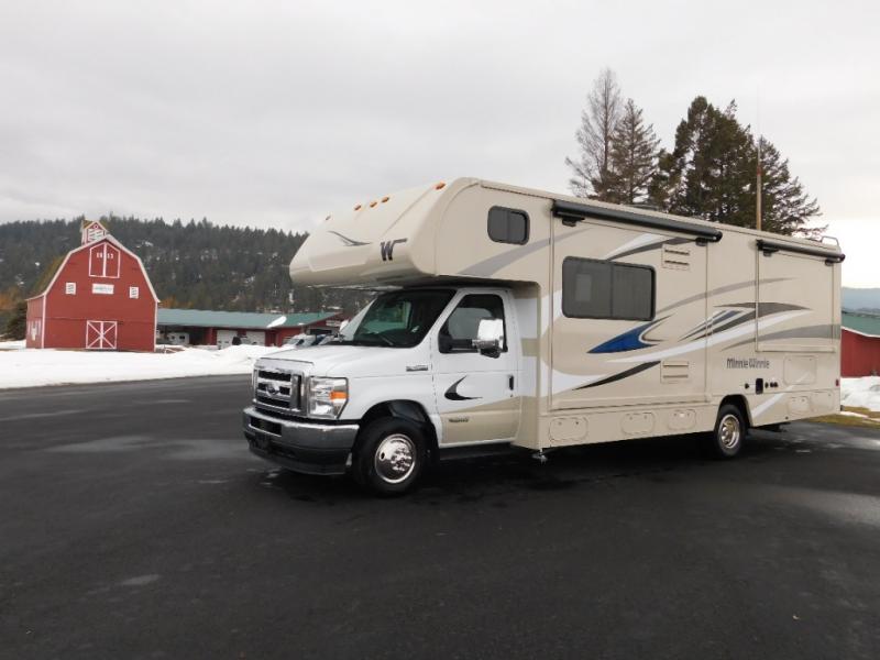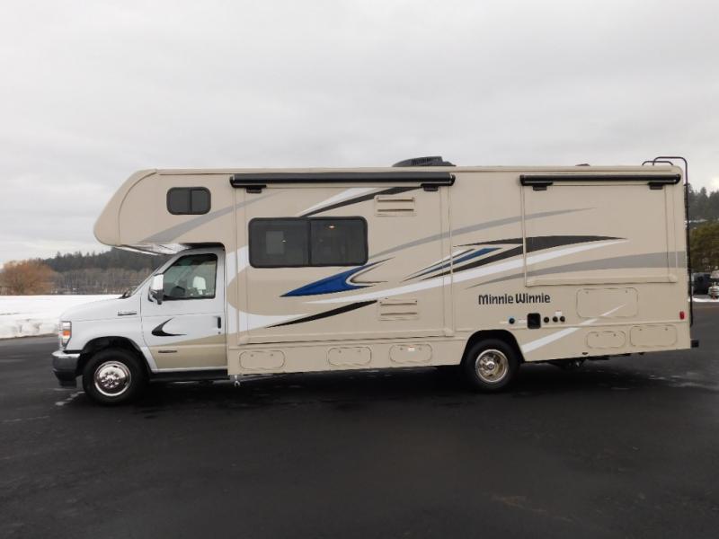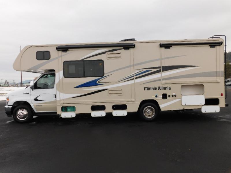 Choose your adventure with one of these Winnebago Minnie Winnie Class C gas motorhomes! The 7.3L V8 premium engine and Ford E350 or E450 chassis makes light work of long hills. Their superior craftsmanship that was designed and built for you is shown through the Smart Driver Assist technology that includes adaptive cruise control, lane departure warning, forward collision warning, and more. With flexible seating/sleeping options and a full galley with Corian solid surface countertops, everyone will stay well rested and fed. You can store all of your traveling necessities between the overhead cabinets throughout the inside and the exterior lighted large trunk storage compartment for your outdoor gear. Come find the model perfect for you today!
