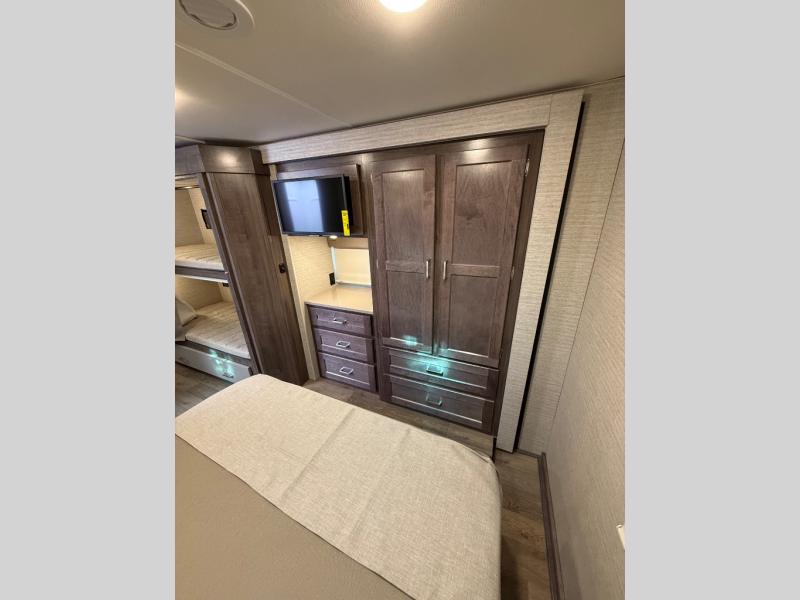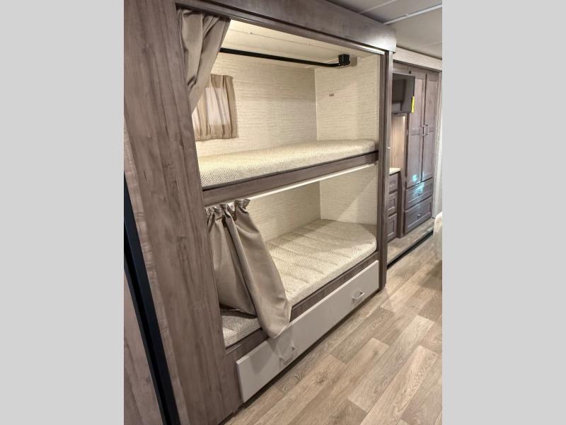 Enjoy plenty of interior space with two slides in this motorhome! The kids will love having a set of 30" x 73" bunk beds to sleep on at night and there is also a 57" x 95" bunk over cab, a 40" x 70" sofa bed, and a 45" x 74" U-shaped dinette that can be transformed for more friends to tag along. If you don't need that much sleeping space then you could switch out the sofa bed for the optional theater seating. The rear private bedroom has a 60" x 75" queen bed with shirt closets and nightstands on either side, a wardrobe, and a chest of drawers with a 32" HDTV for your entertainment. Everyone can stay squeaky clean with the 26" x 38" shower with a skylight for added headroom and natural lighting in the full bathroom!