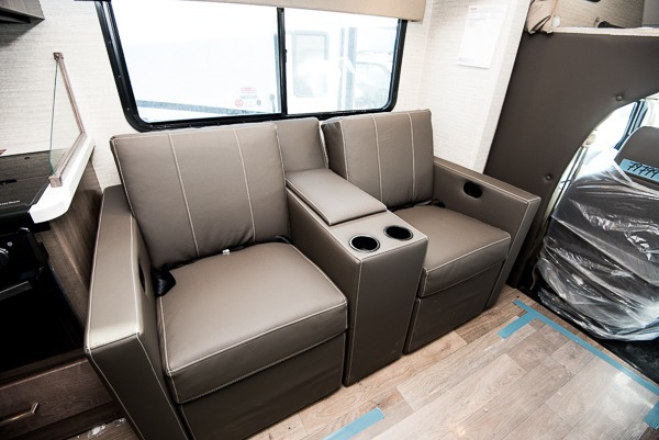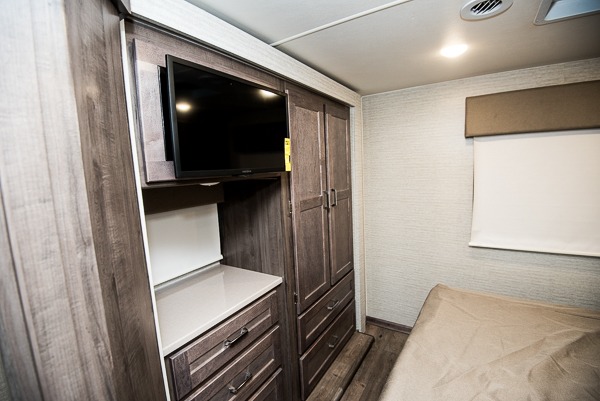 Enjoy plenty of interior space with two slides in this motorhome! The kids will love having a set of 30" x 73" bunk beds to sleep on at night and there is also a 57" x 95" bunk over cab, a 40" x 70" sofa bed, and a 45" x 74" U-shaped dinette that can be transformed for more friends to tag along. If you don't need that much sleeping space then you could switch out the sofa bed for the optional theater seating. The rear private bedroom has a 60" x 75" queen bed with shirt closets and nightstands on either side, a wardrobe, and a chest of drawers with a 32" HDTV for your entertainment. Everyone can stay squeaky clean with the 26" x 38" shower with a skylight for added headroom and natural lighting in the full bathroom!