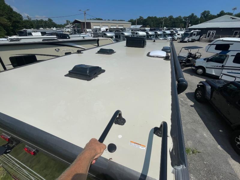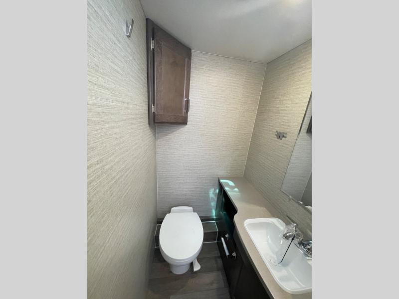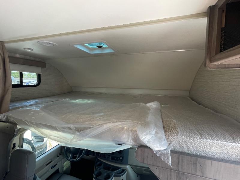 You won't want to travel any other way once you step inside this motorhome! It features a rear private bedroom with a 60" x 80" queen bed that has wardrobes on either side and 24" HDTV for entertainment. The separated bathroom makes it easy for one person to freshen up in the 26" x 30" shower with a skylight while another uses the private toilet and sink. A sliding door closes off the bathroom from the kitchen area which has a three burner range with glass cover and oven and a two way large double door 8 cu. ft. refrigerator/freezer with woodgrain paneling to store your perishables. Enjoy your meals at the 45" x 82" U-shaped dinette then relax on the 40" x 60" sofa bed which can be switched out for either the optional theater seating or optional 58" x 74" TrueComfort sofa. You even have a 57" x 95" bunk over cab for sleeping or storage space!